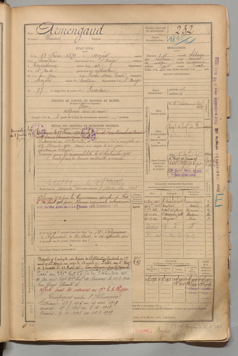 | Armengaud | Clément | FOIX | 1 R 456 | 1899 | Mazères | Carcassonne | 232 |