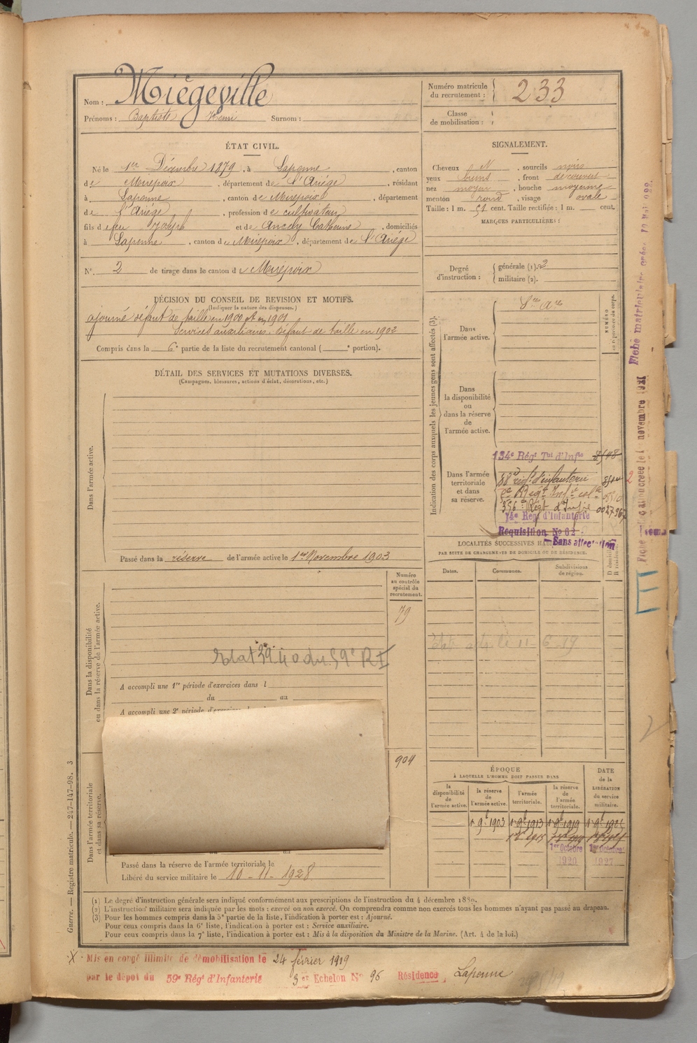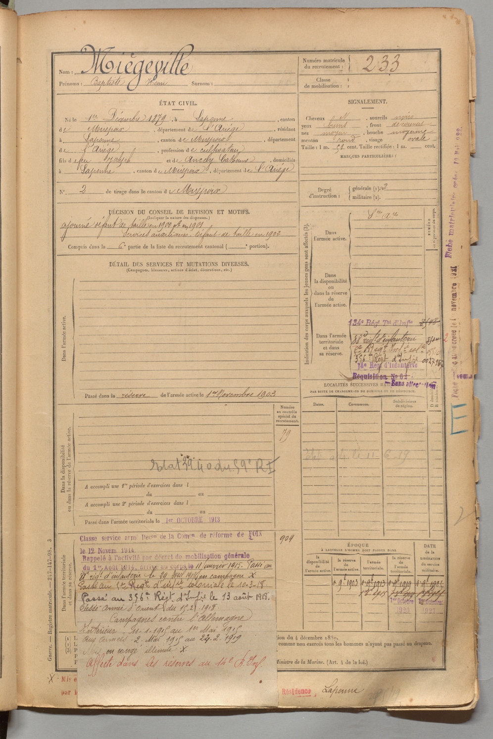 | Miègeville | Baptiste Henri | FOIX | 1 R 456 | 1899 | Lapenne | Lapenne | 233 |