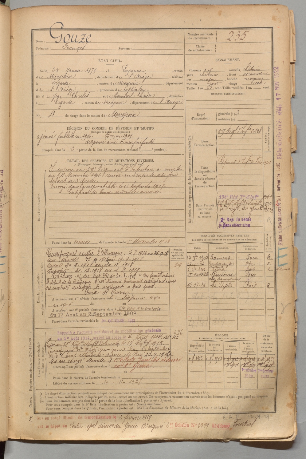 | Gouze | François | FOIX | 1 R 456 | 1899 | Lapenne | Lagarde | 235 |