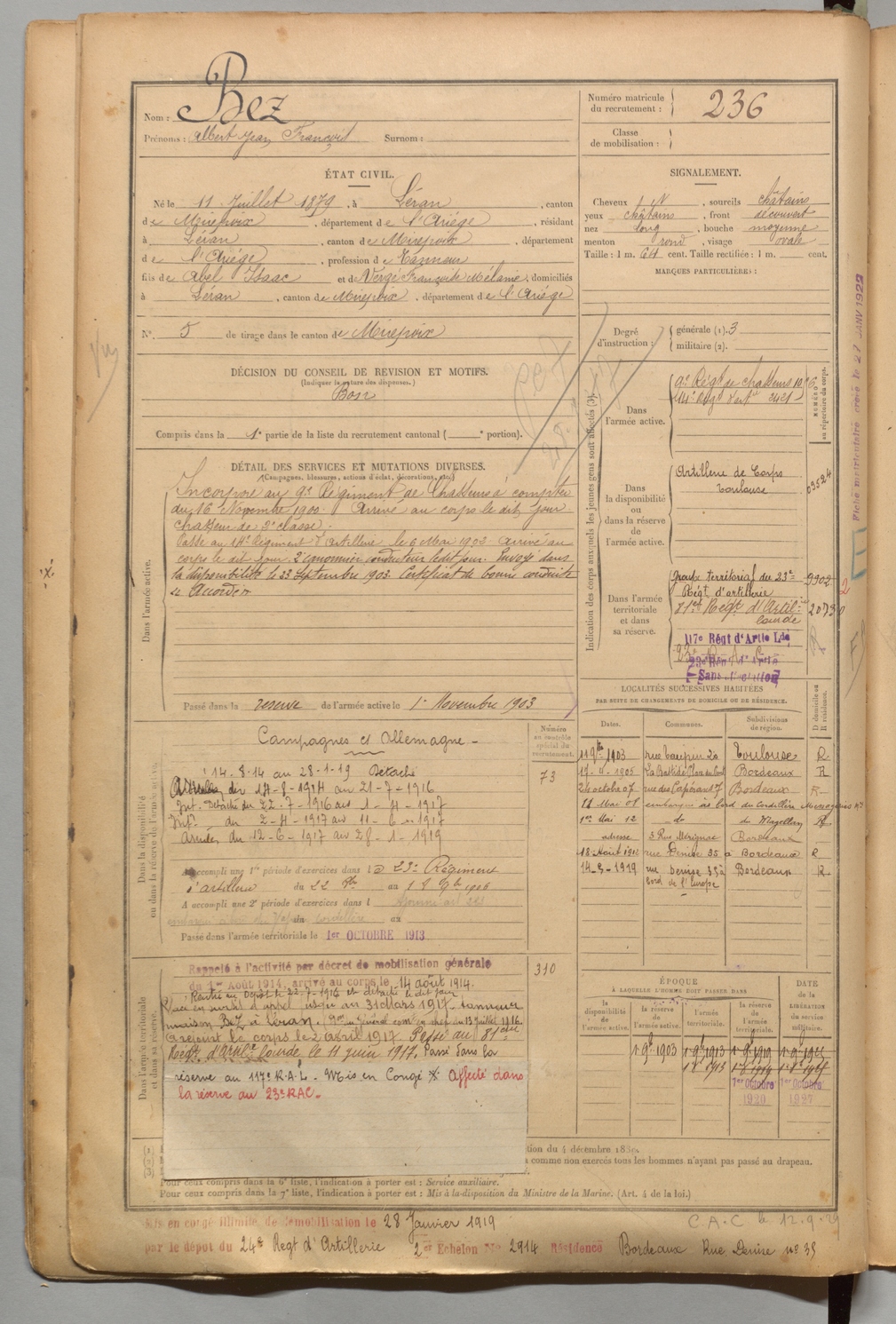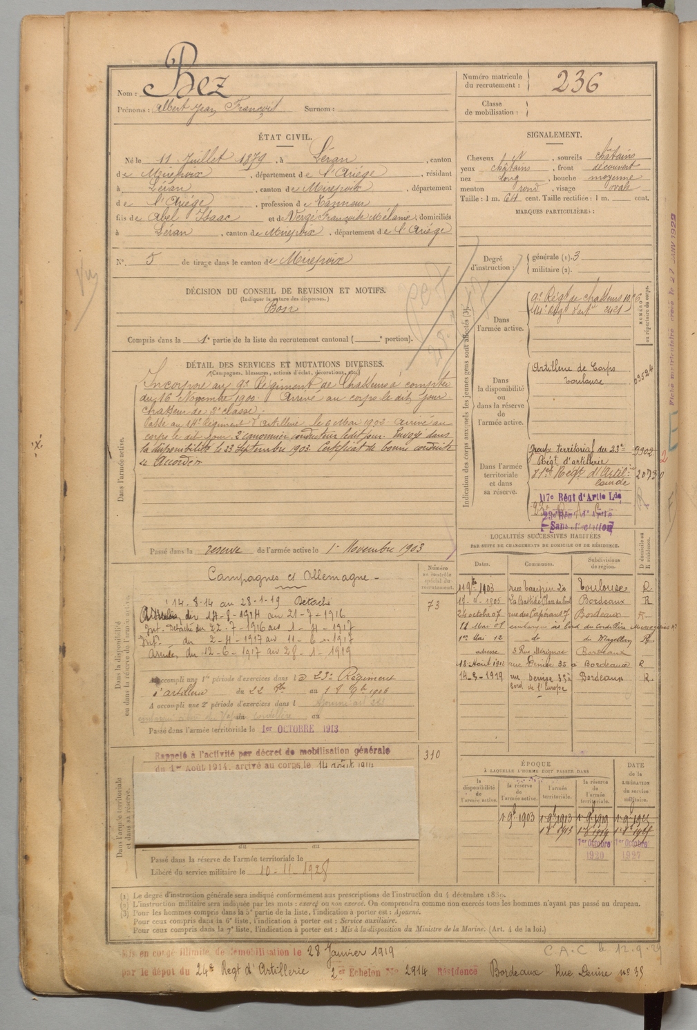 | Bez | Albert Jean François | FOIX | 1 R 456 | 1899 | Léran | Léran | 236 |