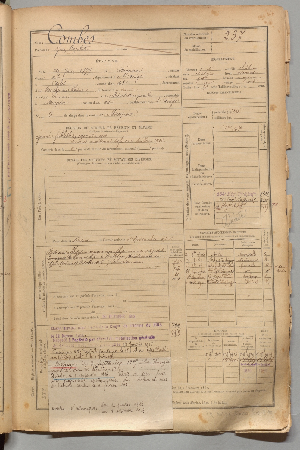 | Combes | Jean Baptiste | FOIX | 1 R 456 | 1899 | Mirepoix | Arles | 237 |