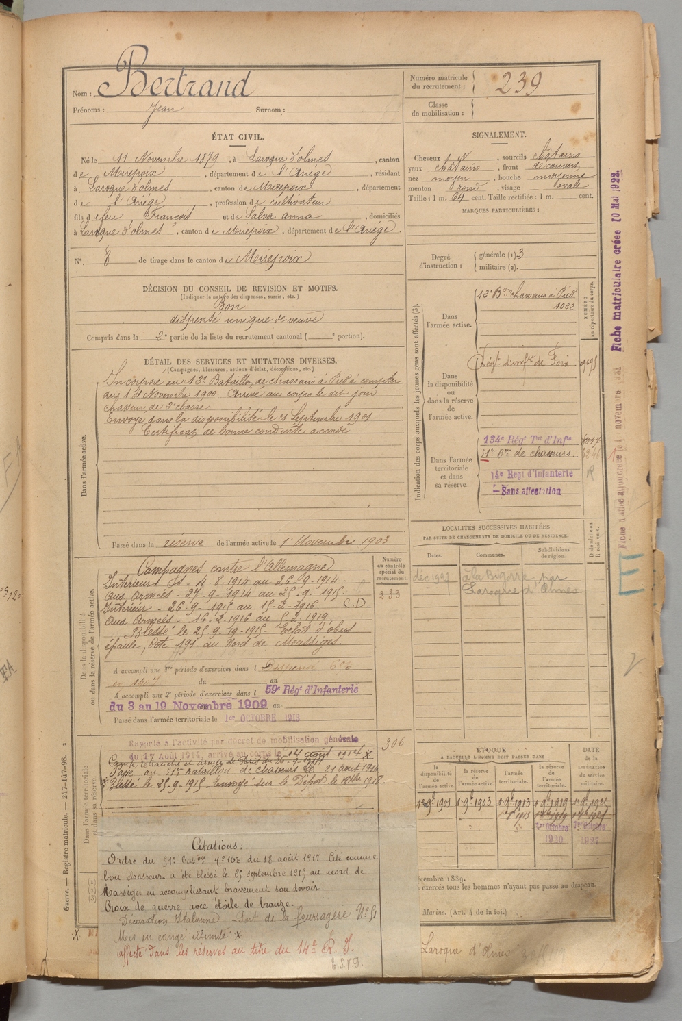 | Bertrand | Jean | FOIX | 1 R 456 | 1899 | Laroque-d'Olmes | Laroque-d'Olmes | 239 |