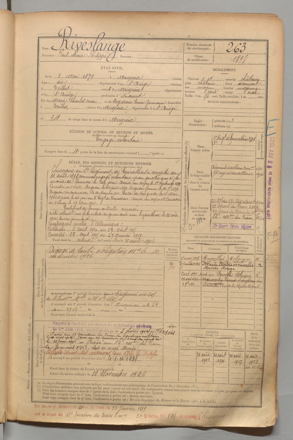 | Riveslange | Paul Marie Philippe | FOIX | 1 R 456 | 1899 | Mirepoix | Teilhet | 263 |
