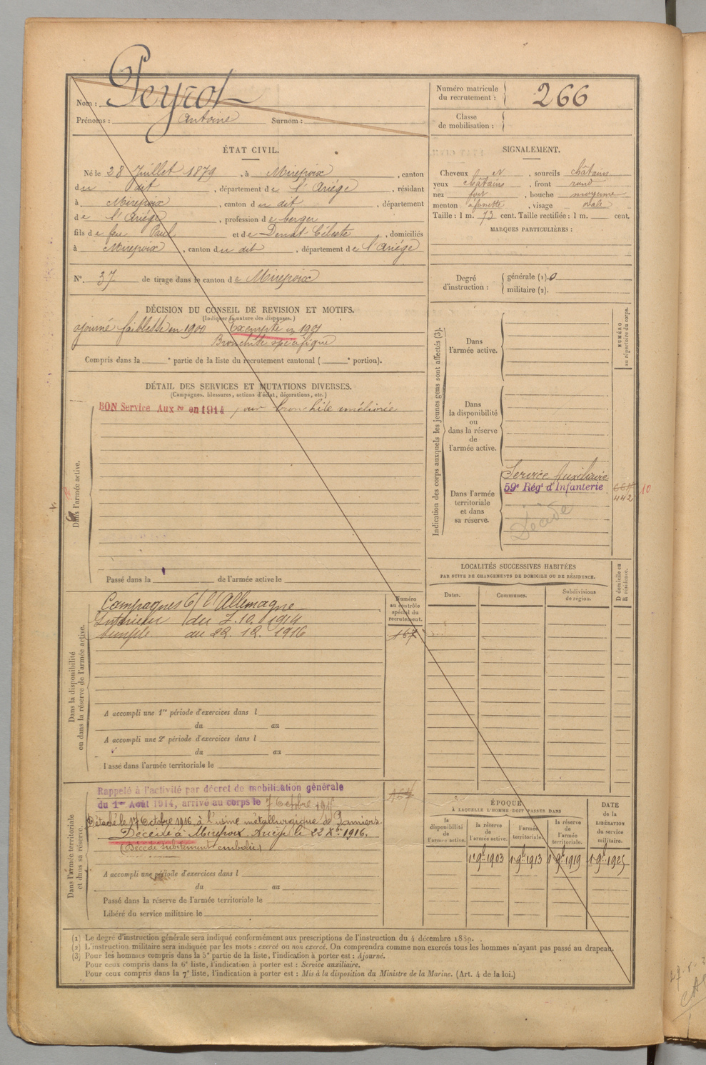 | Peyrot | Antoine | FOIX | 1 R 456 | 1899 | Mirepoix | Mirepoix | 266 |