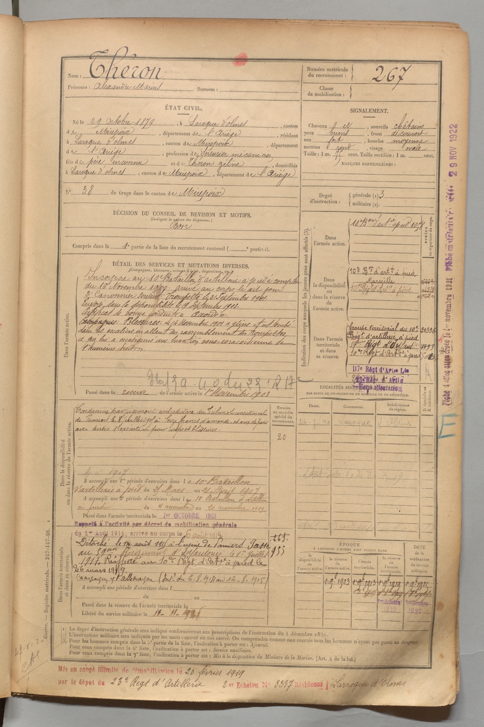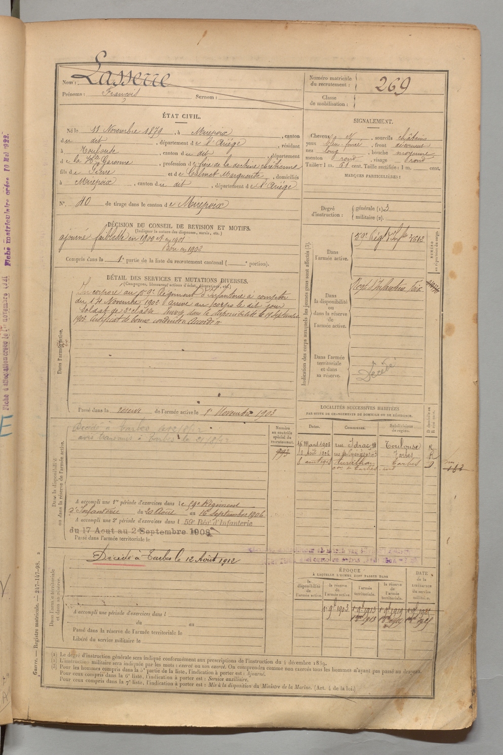 | Lasserre | François | FOIX | 1 R 456 | 1899 | Mirepoix | Toulouse | 269 |