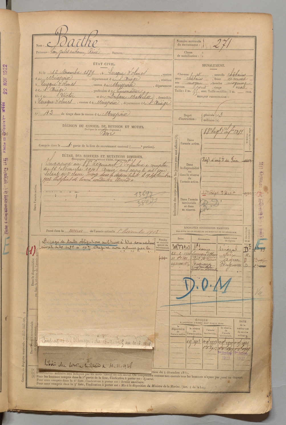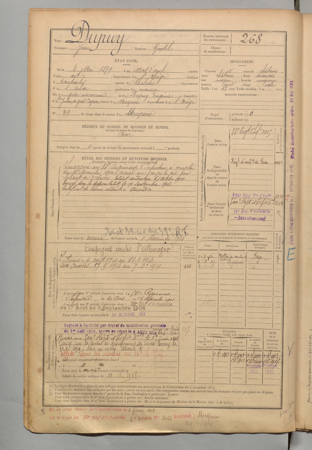 | Dupuy | Jean dit Gentil | FOIX | 1 R 456 | 1899 | Mas-d'Azil (Le) | Courtauly | 268 |