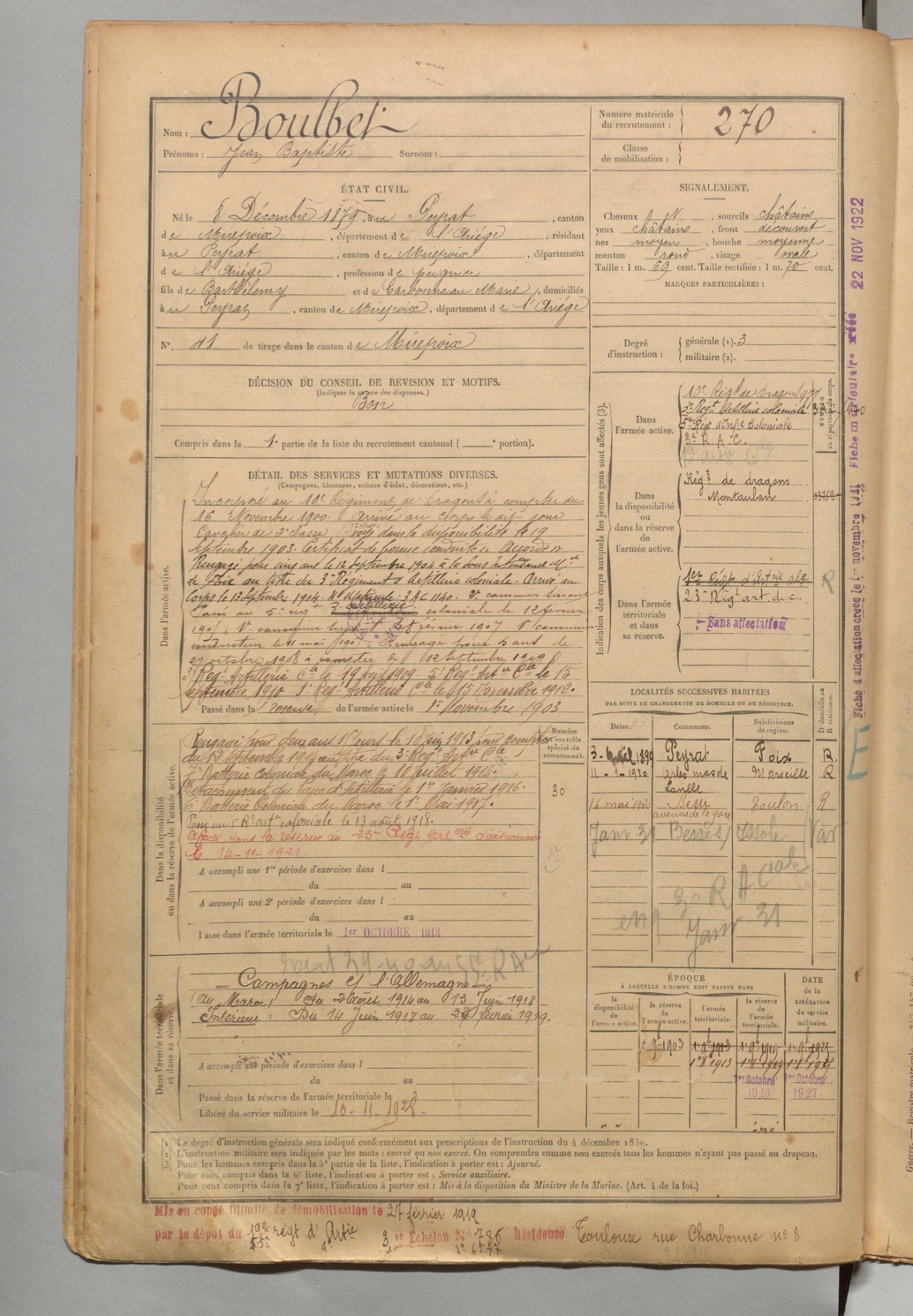 | Boulbet | Jean Baptiste | FOIX | 1 R 456 | 1899 | Peyrat (Le) | Peyrat (Le) | 270 |