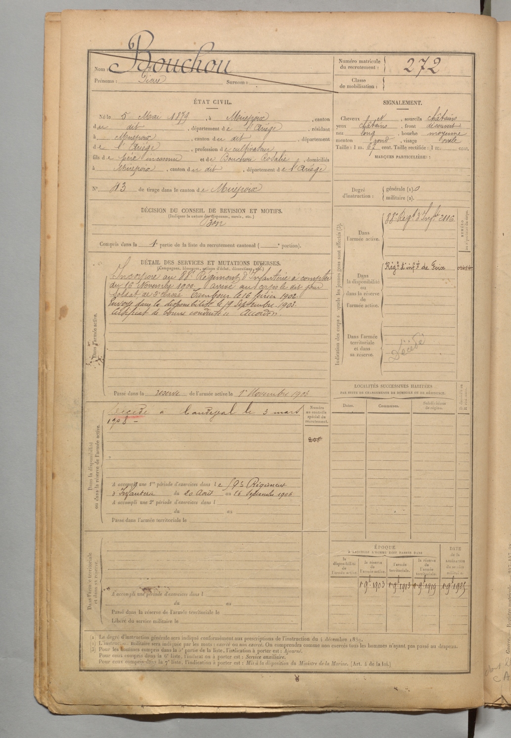 | Bouchou | Pierre | FOIX | 1 R 456 | 1899 | Mirepoix | Mirepoix | 272 |