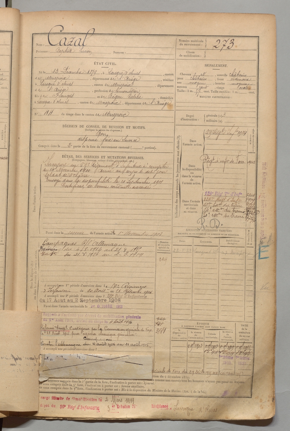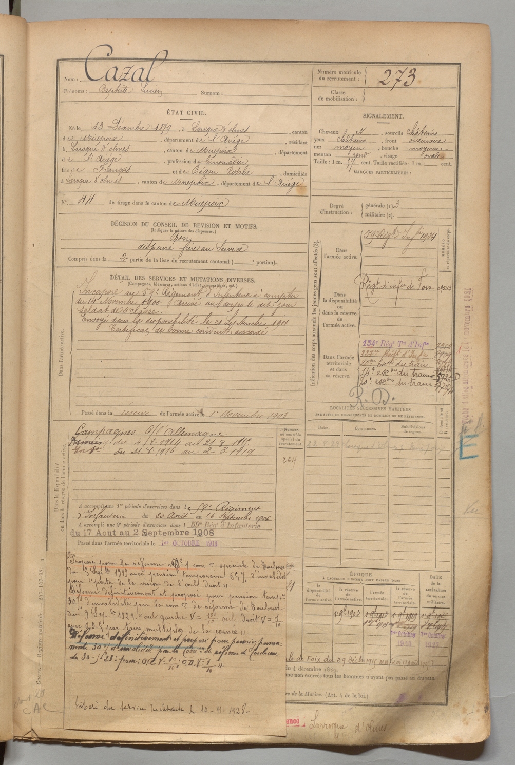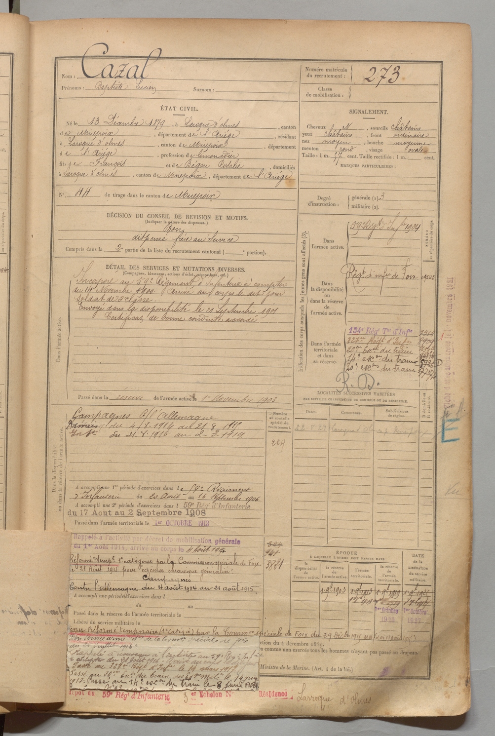 | Cazal | Baptiste Lucien | FOIX | 1 R 456 | 1899 | Laroque-d'Olmes | Laroque-d'Olmes | 273 |