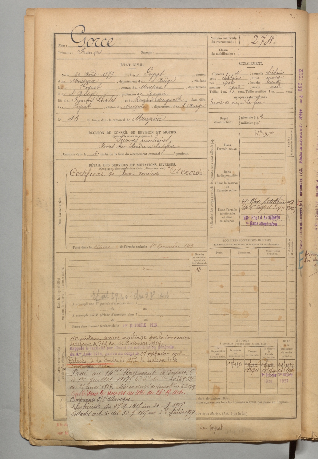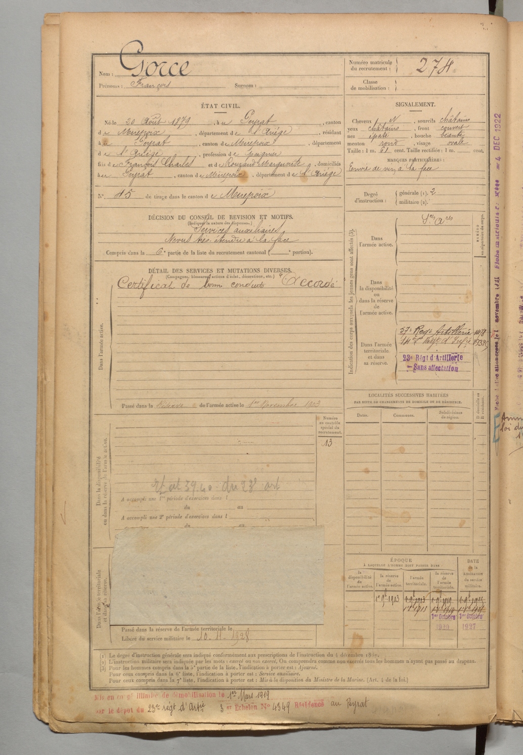 | Gorce | François | FOIX | 1 R 456 | 1899 | Peyrat (Le) | Peyrat (Le) | 274 |