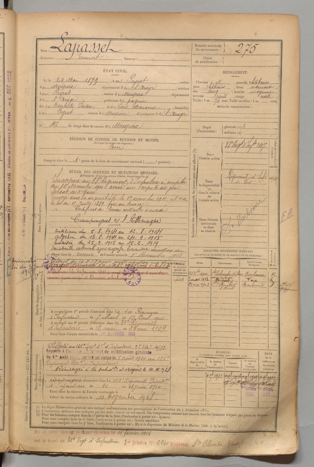 | Lapasset | Evenort | FOIX | 1 R 456 | 1899 | Peyrat (Le) | Peyrat (Le) | 275 |