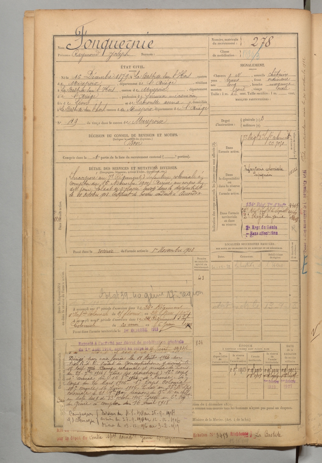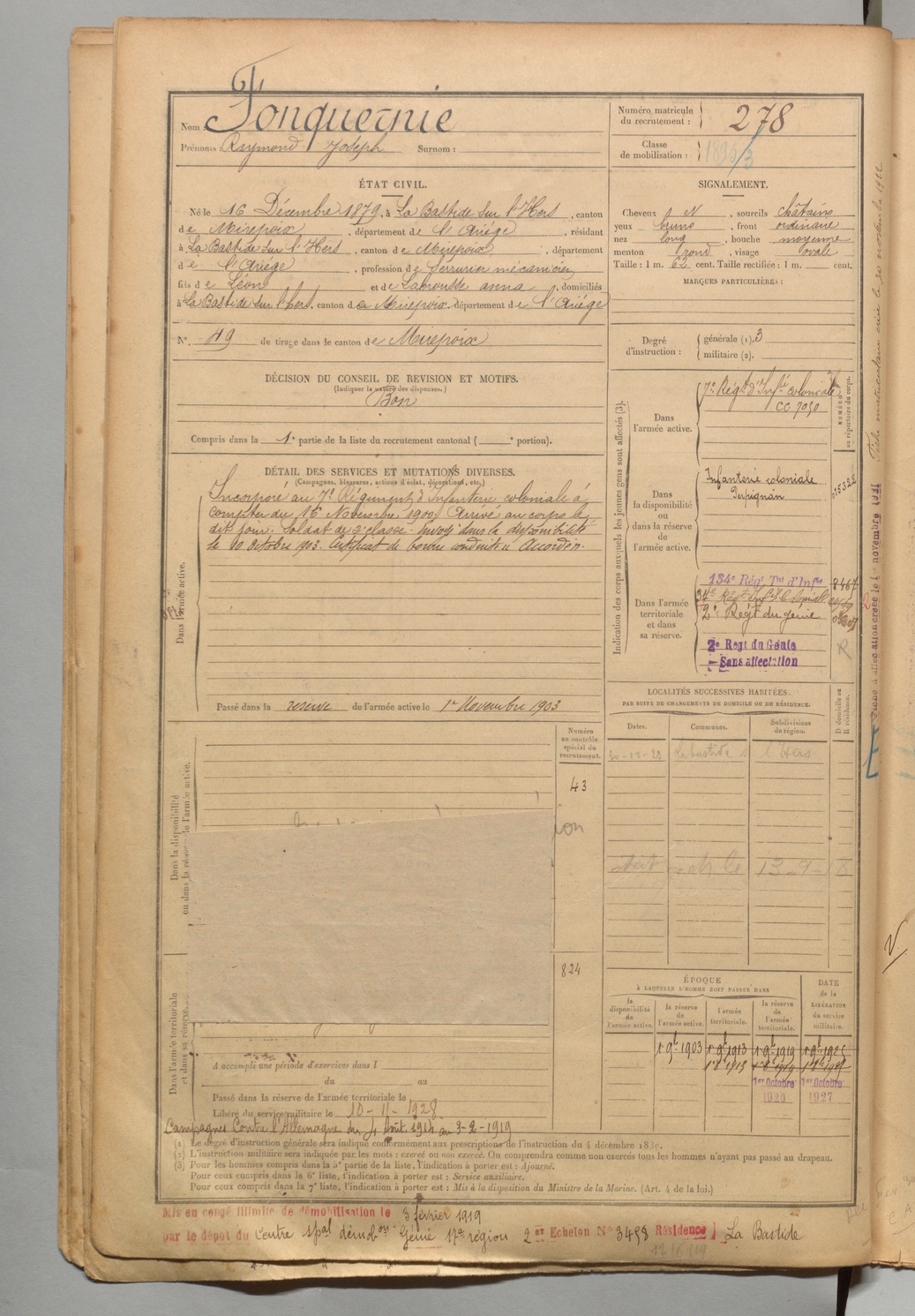 | Fonquernie | Raymond Joseph | FOIX | 1 R 456 | 1899 | Bastide-sur-l'Hers (La) | Bastide-sur-l'Hers (La) | 278 |