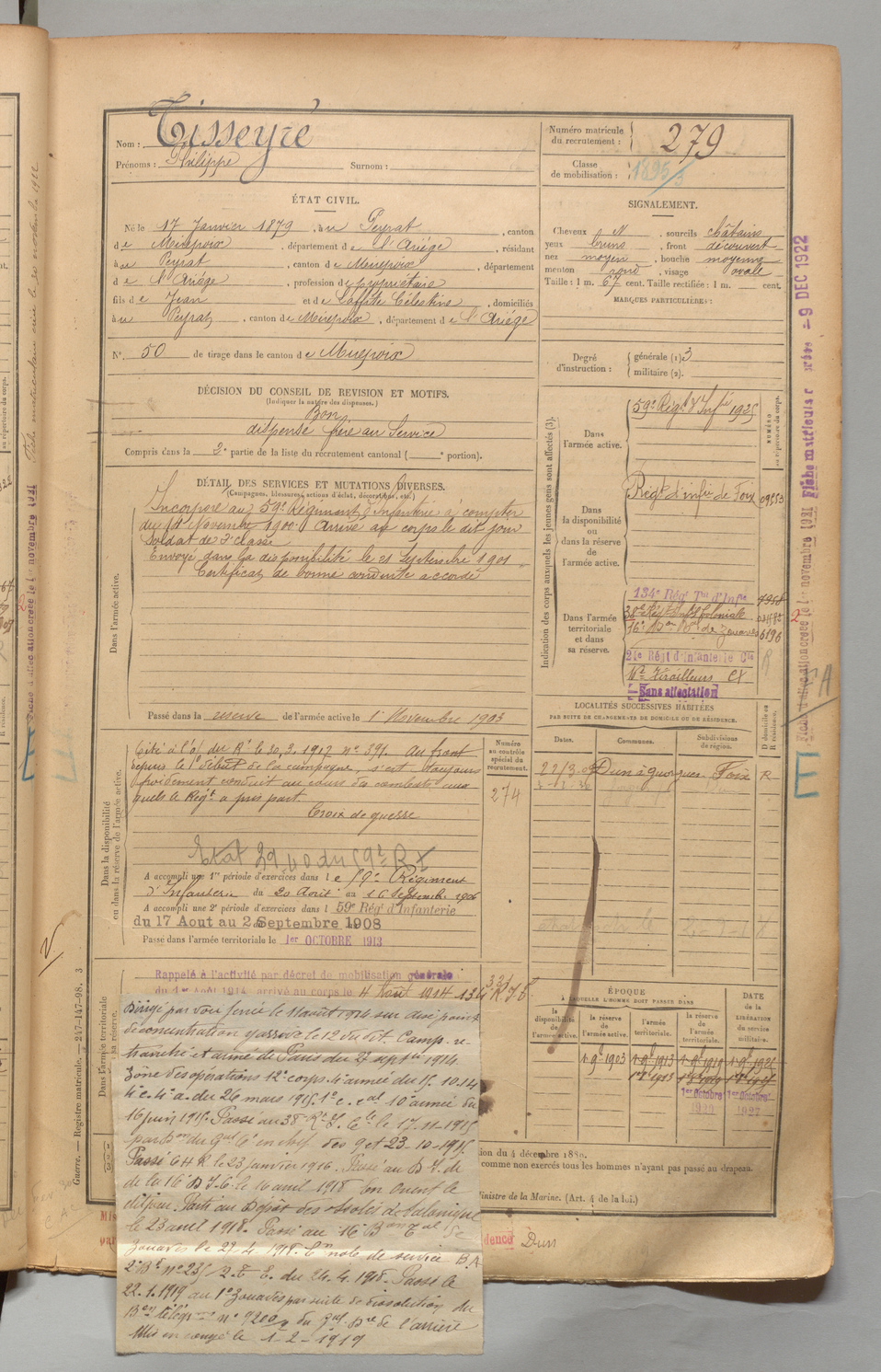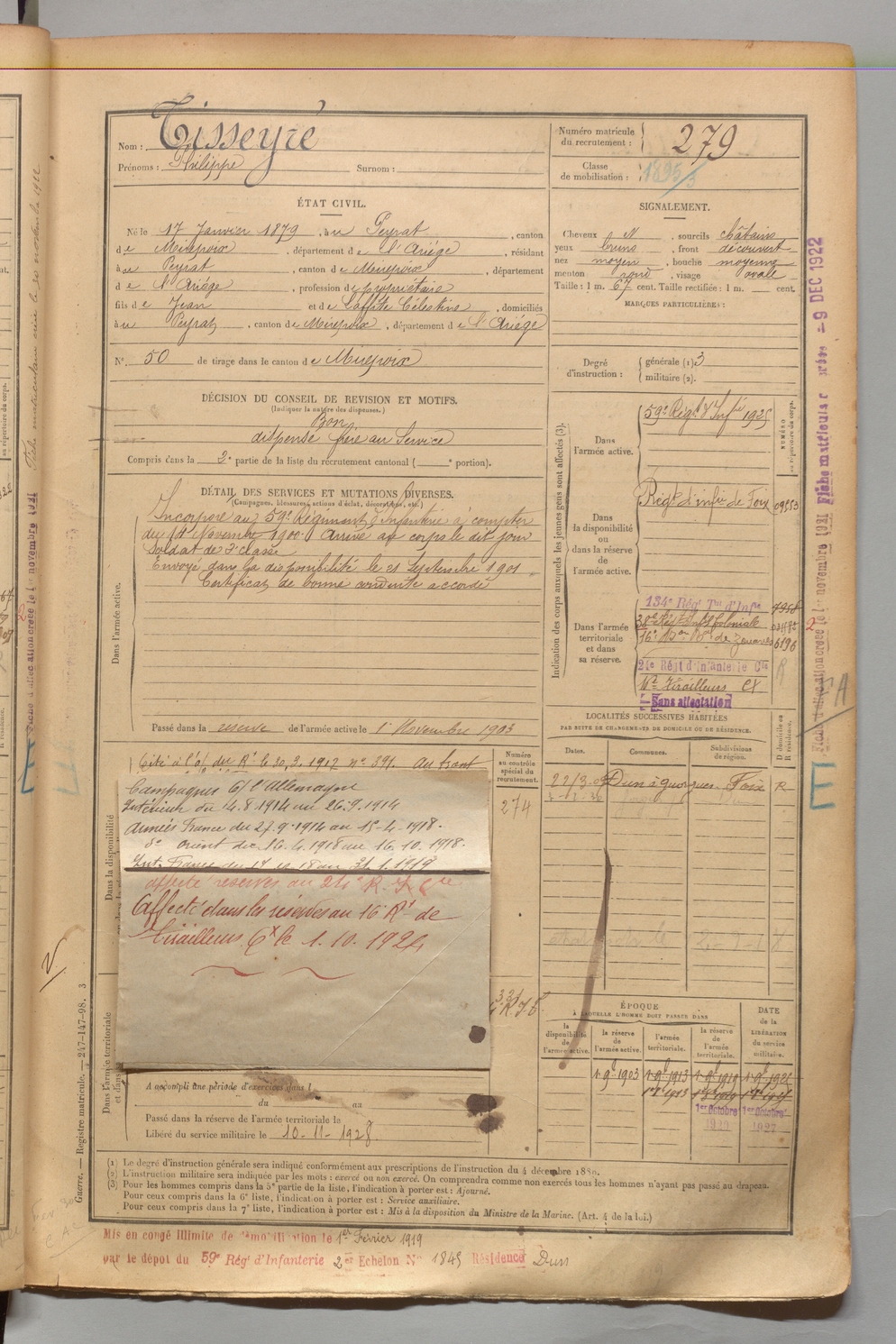 | Tisseyré | Philippe | FOIX | 1 R 456 | 1899 | Peyrat (Le) | Peyrat (Le) | 279 |