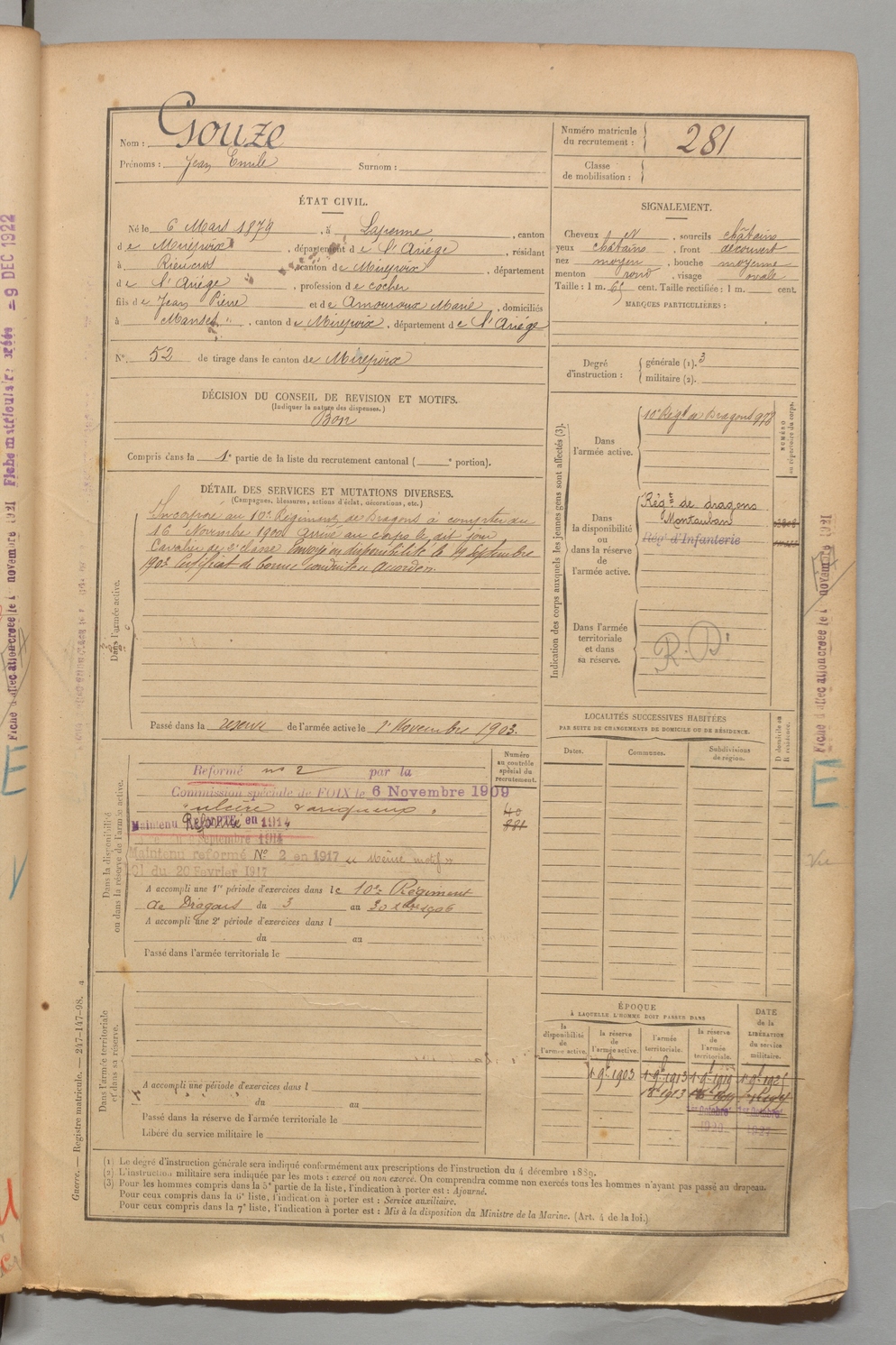 | Gouze | Jean Emile | FOIX | 1 R 456 | 1899 | Lapenne | Rieucros | 281 |