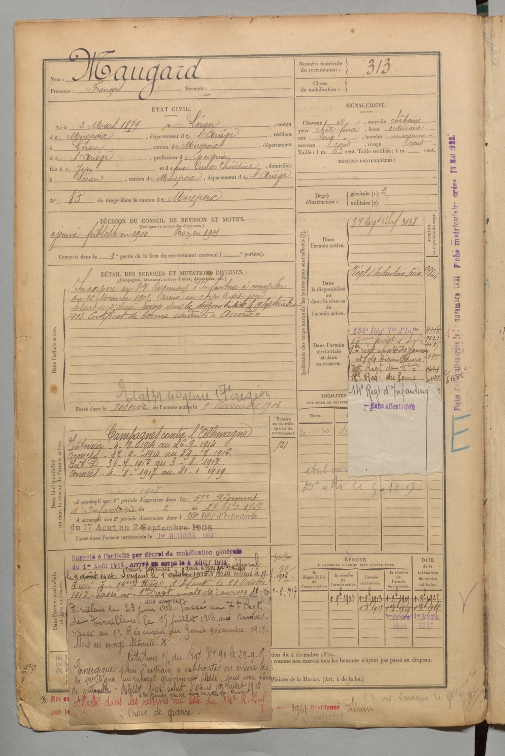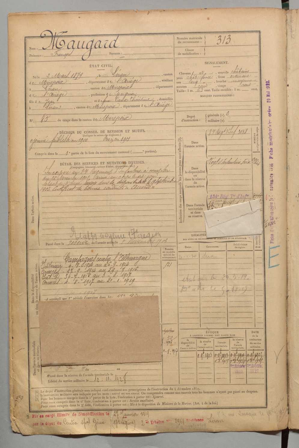 | Maugard | François | FOIX | 1 R 456 | 1899 | Léran | Léran | 313 |