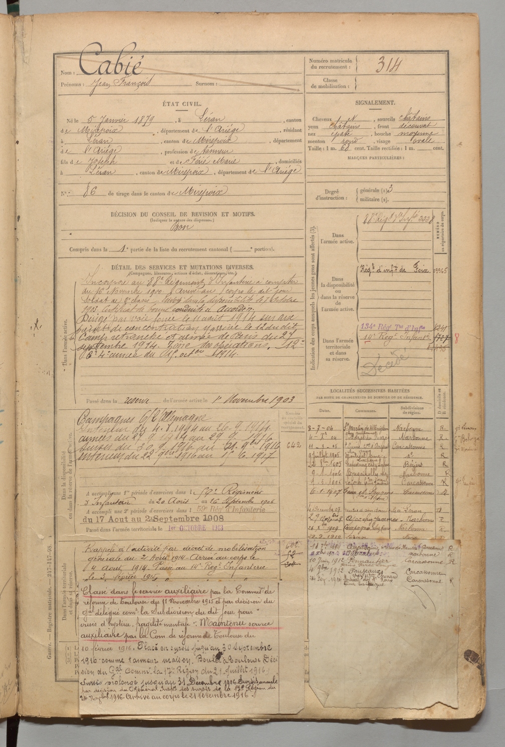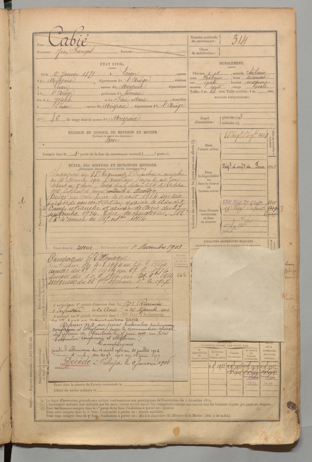 | Cabié | Jean François | FOIX | 1 R 456 | 1899 | Léran | Léran | 314 |