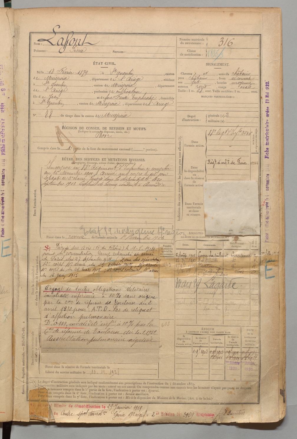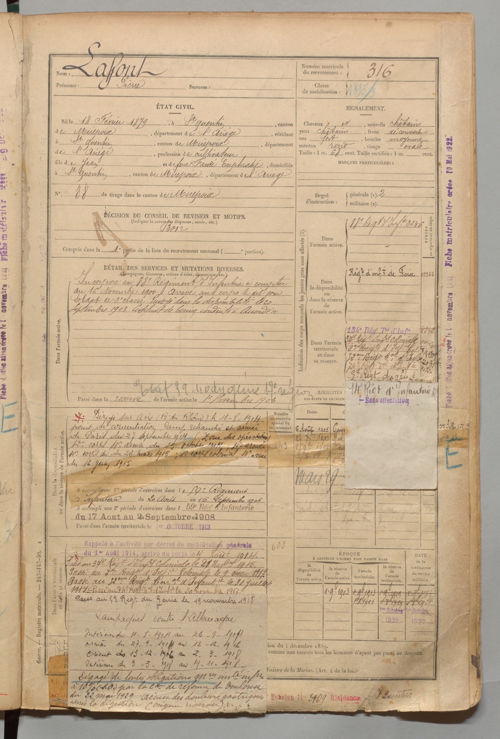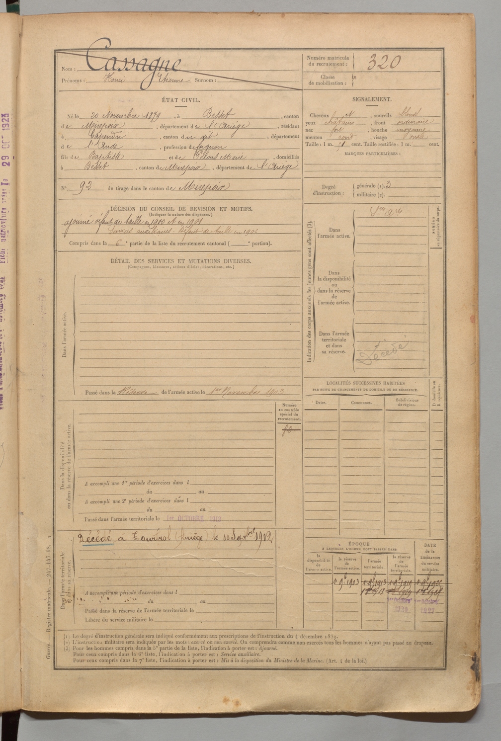 | Cassagne | Henri Etienne | FOIX | 1 R 456 | 1899 | Besset | Capendu | 320 |