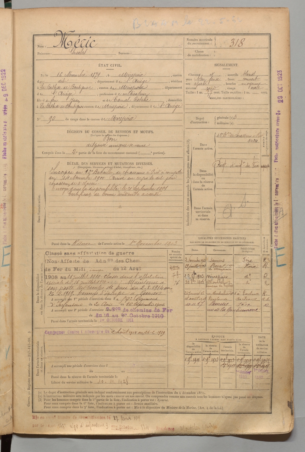 | Méric | Charles | FOIX | 1 R 456 | 1899 | Mirepoix | Bastide-de-Bousignac (La) | 318 |