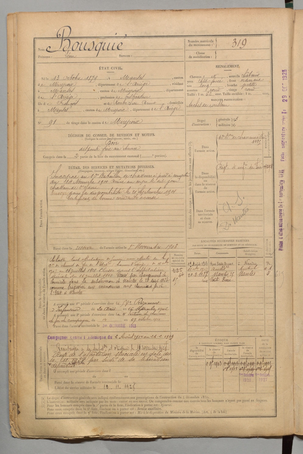 | Bousquié | Léon | FOIX | 1 R 456 | 1899 | Manses | Manses | 319 |