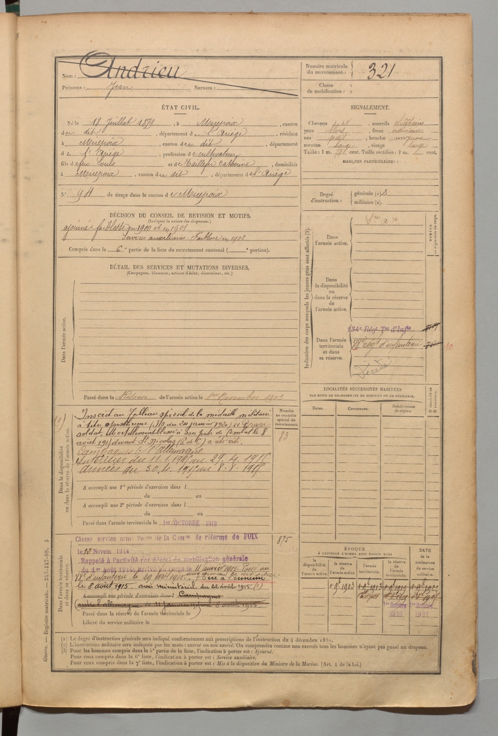| Andrieu | Jean | FOIX | 1 R 456 | 1899 | Mirepoix | Mirepoix | 321 |