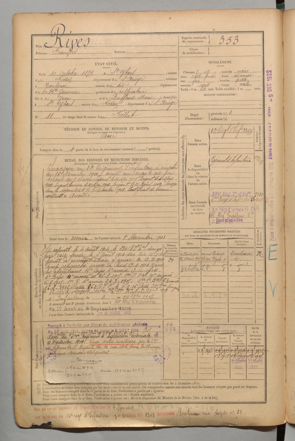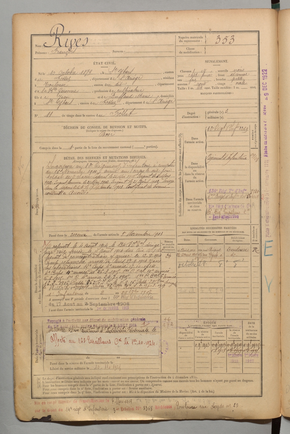 | Rives | François | FOIX | 1 R 456 | 1899 | Saint-Ybars | Toulouse | 353 |