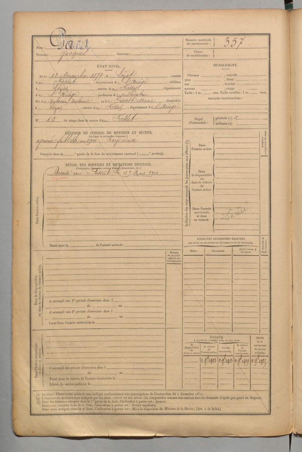 | Gars | Jacques | FOIX | 1 R 456 | 1899 | Lézat-sur-Lèze | Lézat-sur-Lèze | 357 |