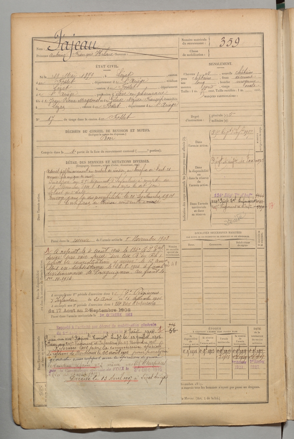 | Fajeau | Antoine François Hilaire | FOIX | 1 R 456 | 1899 | Lézat-sur-Lèze | Lézat-sur-Lèze | 359 |