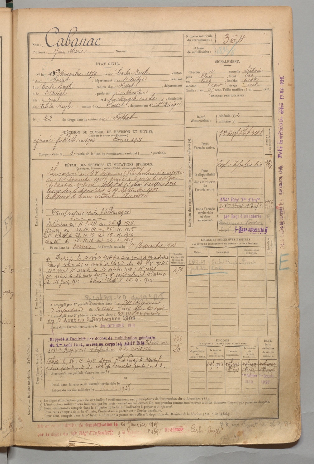 | Cabanac | Jean Marie | FOIX | 1 R 456 | 1899 | Carla-Bayle (Le) | Carla-Bayle (Le) | 364 |