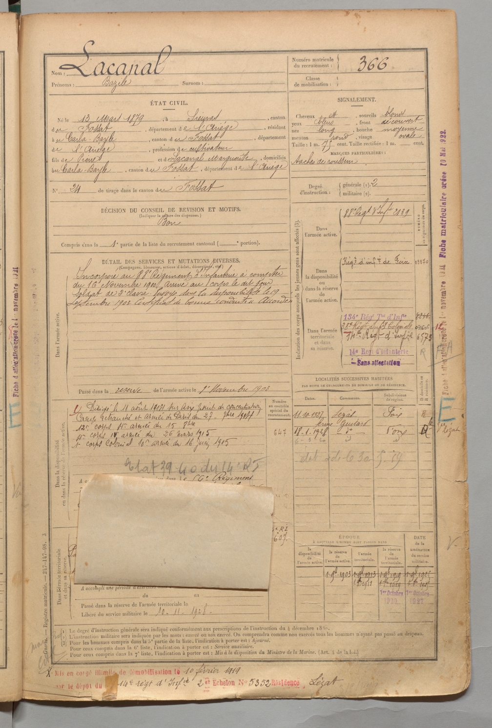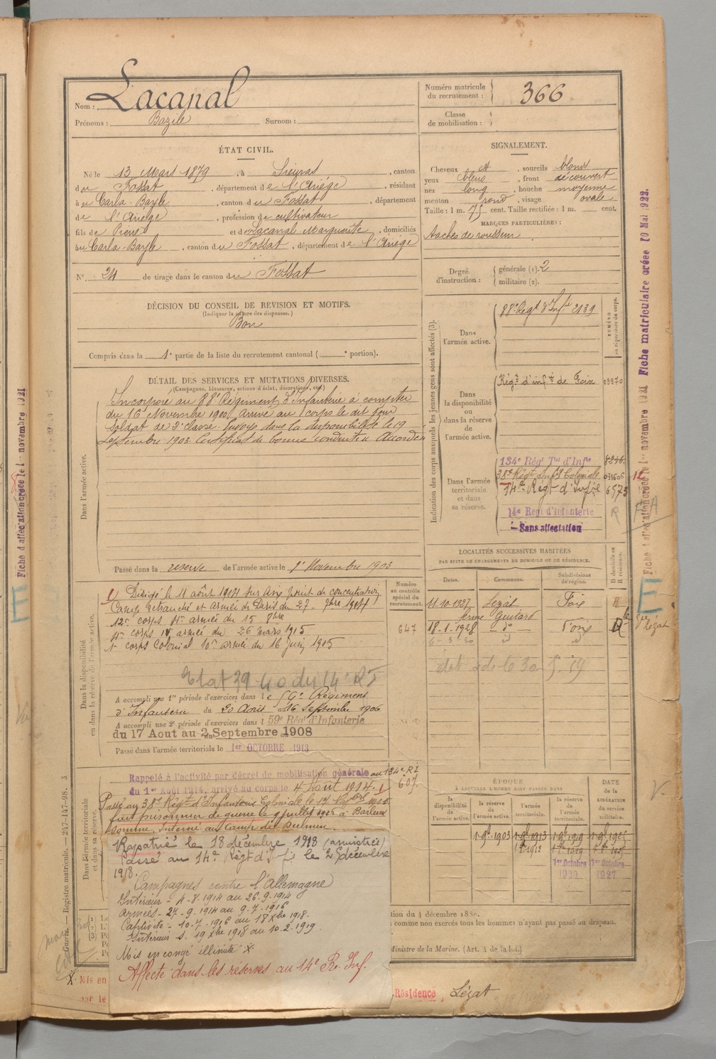 | Lacanal | Bazile | FOIX | 1 R 456 | 1899 | Sieuras | Carla-Bayle (Le) | 366 |