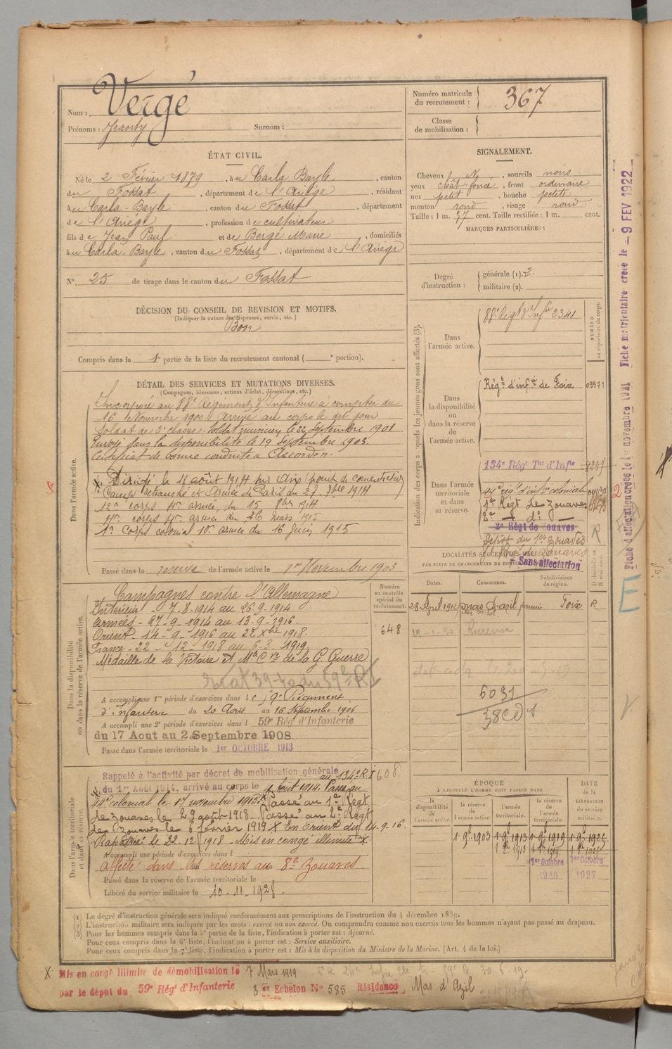 | Vergé | Jeanty | FOIX | 1 R 456 | 1899 | Carla-Bayle (Le) | Carla-Bayle (Le) | 367 |