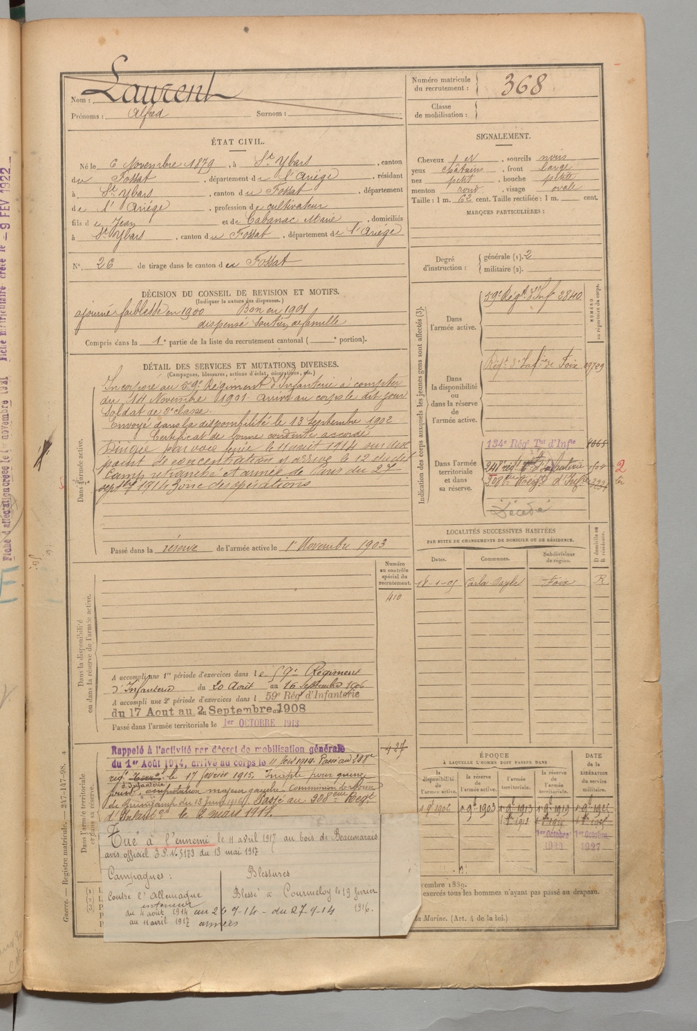 | Laurent | Alfred | FOIX | 1 R 456 | 1899 | Saint-Ybars | Saint-Ybars | 368 |