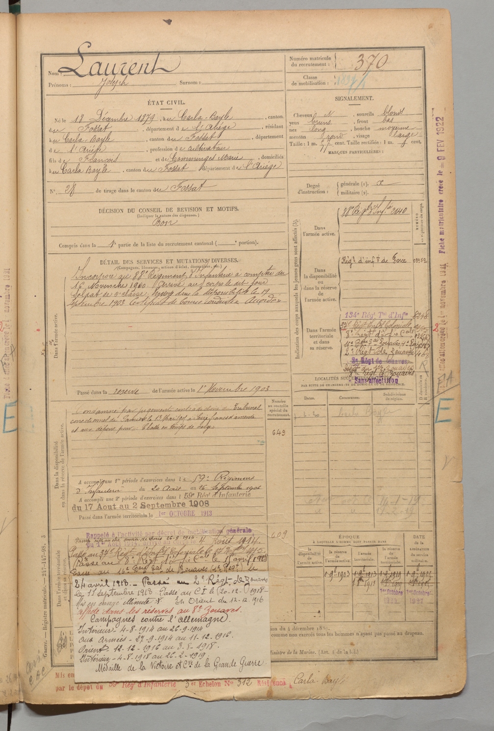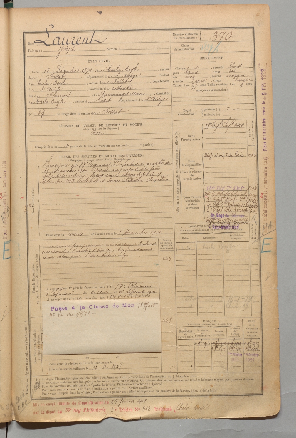 | Laurent | Joseph | FOIX | 1 R 456 | 1899 | Carla-Bayle (Le) | Carla-Bayle (Le) | 370 |