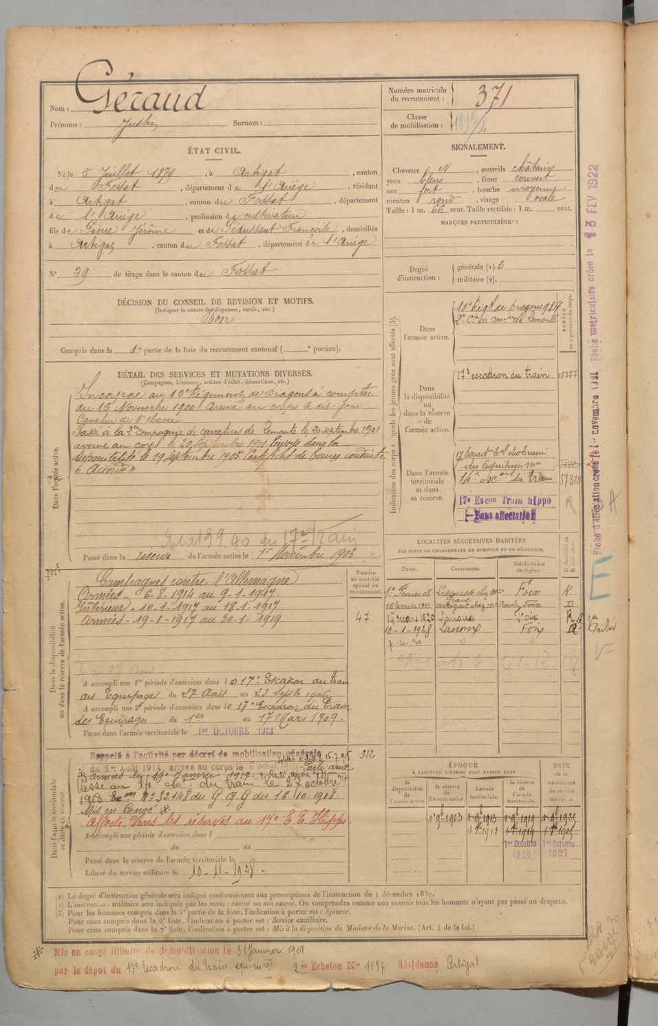 | Géraud | Justin | FOIX | 1 R 456 | 1899 | Artigat | Artigat | 371 |