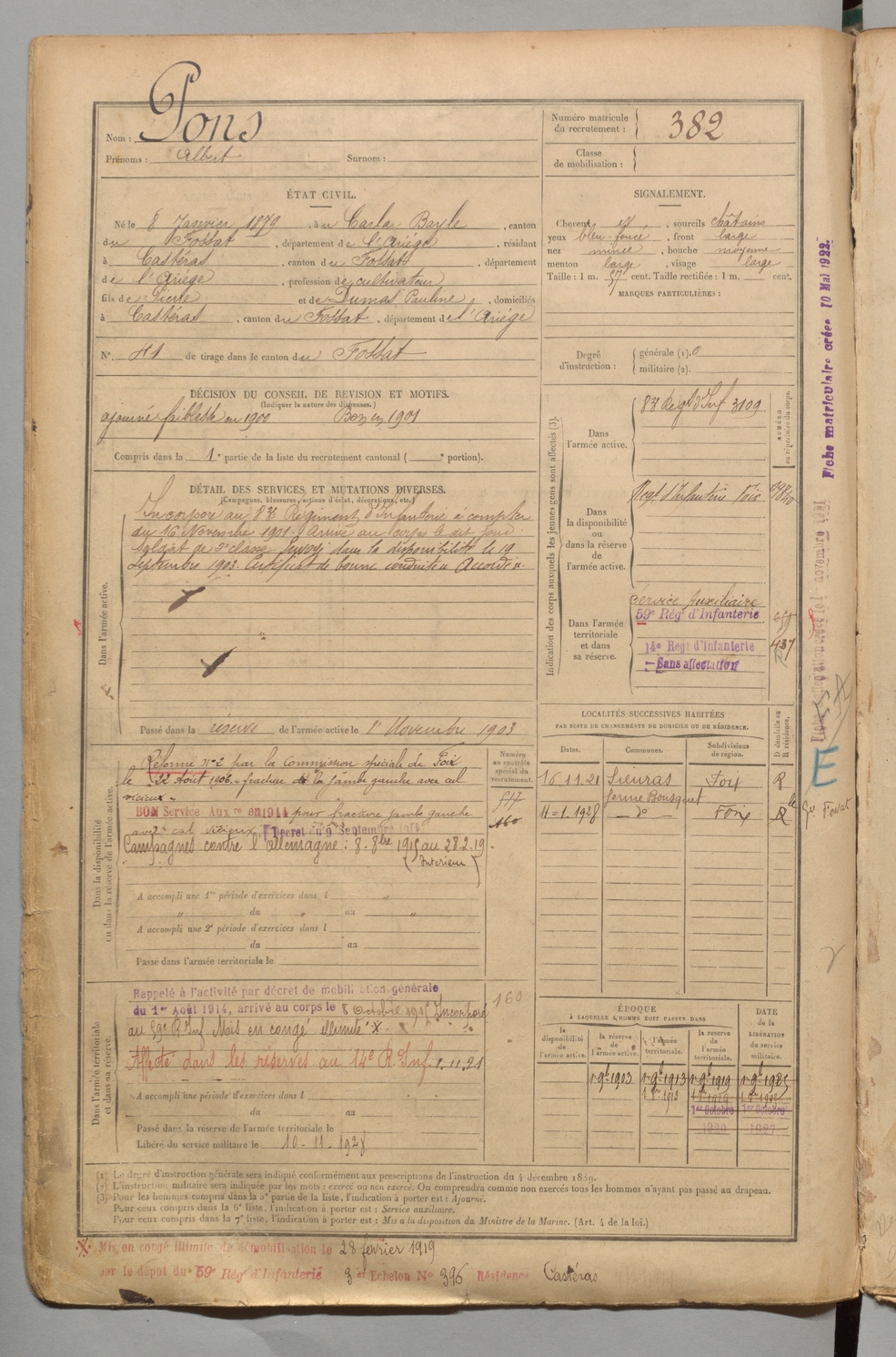 | Pons | Albert | FOIX | 1 R 456 | 1899 | Carla-Bayle (Le) | Castéras | 382 |