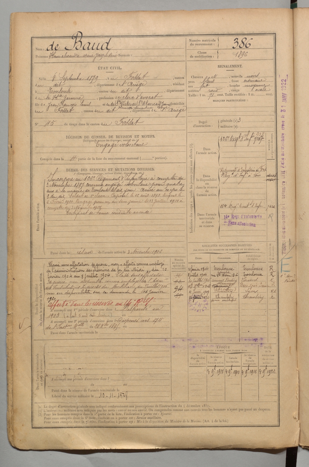 | De Baud | Henri Alexandre Marie Joseph René | FOIX | 1 R 456 | 1899 | Fossat (Le) | Toulouse | 386 |