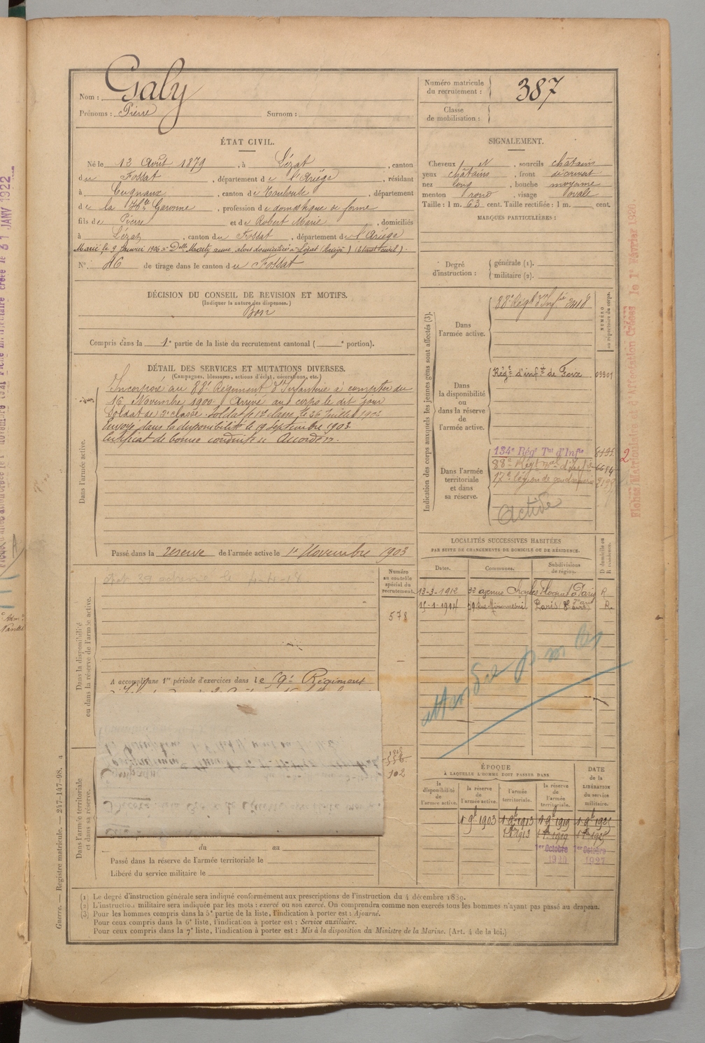 | Galy | Pierre | FOIX | 1 R 456 | 1899 | Lézat-sur-Lèze | Cugnaux | 387 |