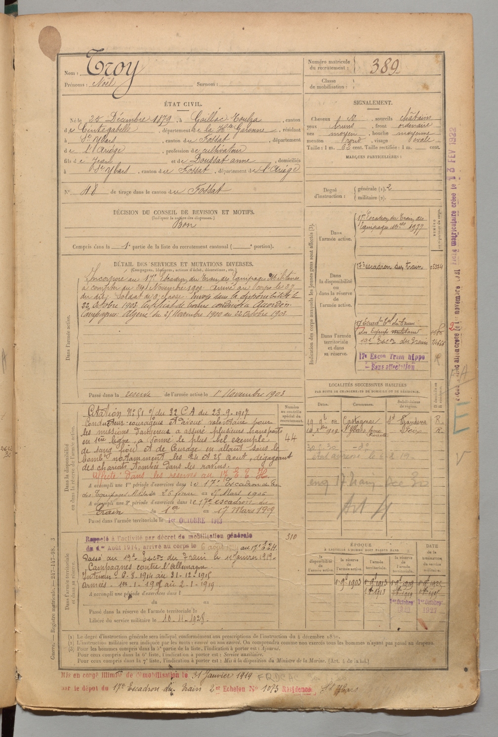 | Troy | Noël | FOIX | 1 R 456 | 1899 | Gaillac-Toulza | Saint-Ybars | 389 |