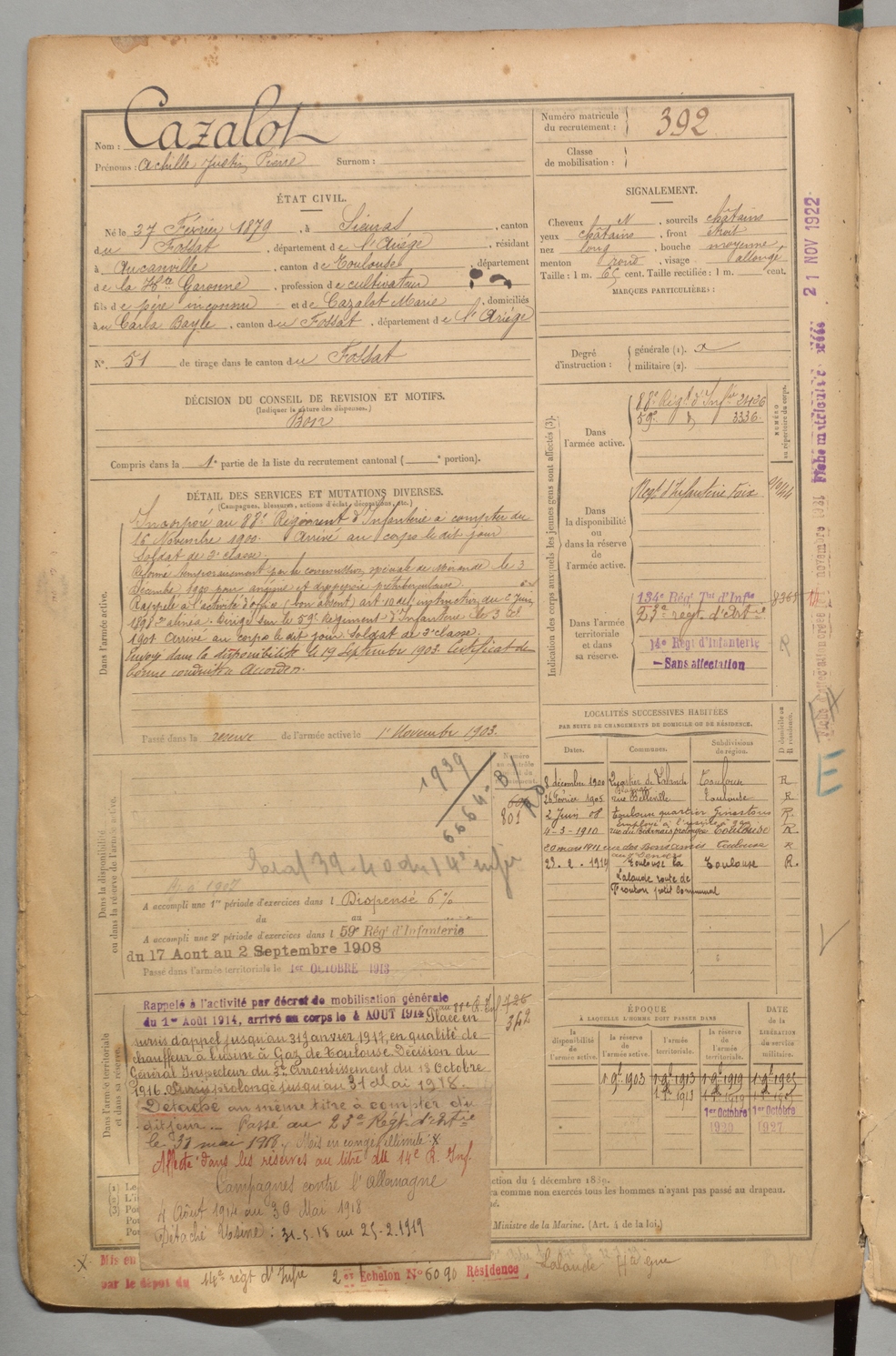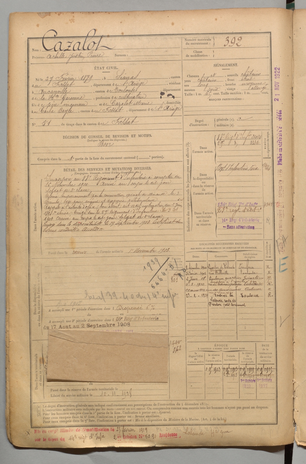 | Cazalot | Achille Justin Pierre | FOIX | 1 R 456 | 1899 | Sieuras | Aucamville | 392 |