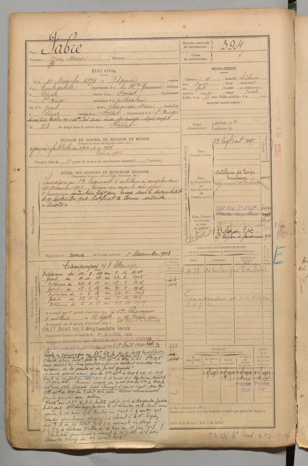 | Fabre | Jean Marie | FOIX | 1 R 456 | 1899 | Esperce | Lézat-sur-Lèze | 394 |