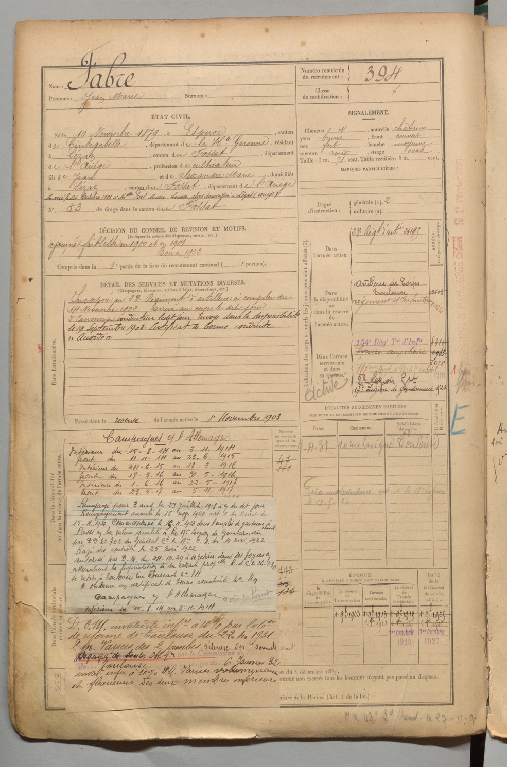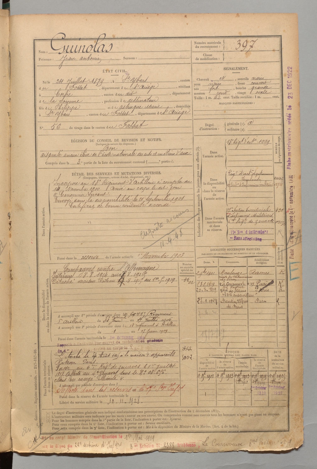 | Guinolas | Jean Antonin | FOIX | 1 R 456 | 1899 | Saint-Ybars | Corbie | 397 |