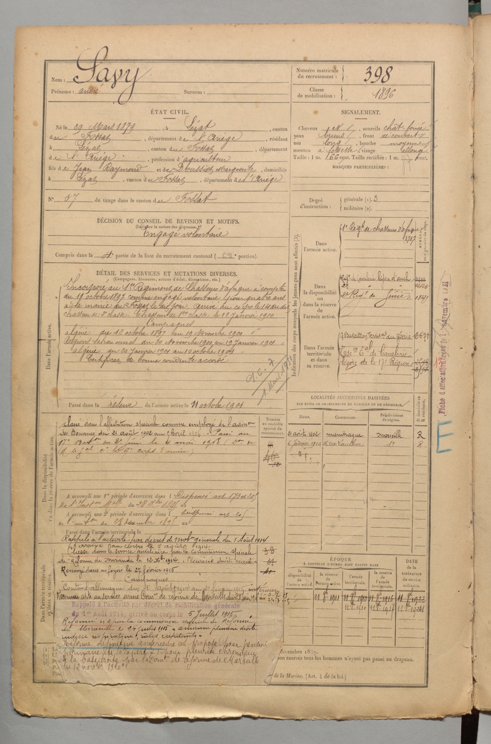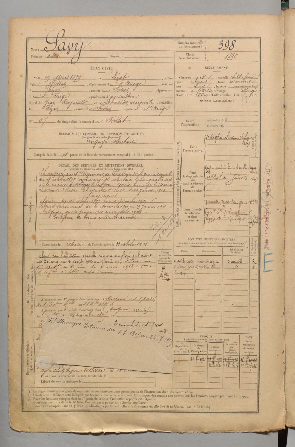 | Savy | André | FOIX | 1 R 456 | 1899 | Lézat-sur-Lèze | Lézat-sur-Lèze | 398 |