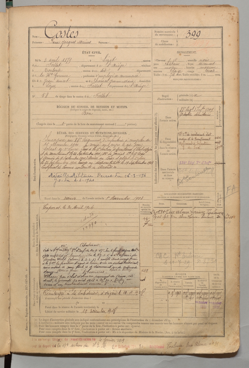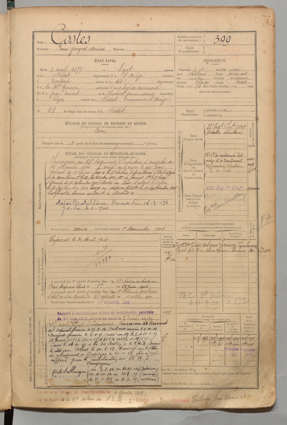 | Costes | Pierre Jacques Marius | FOIX | 1 R 456 | 1899 | Lézat-sur-Lèze | Toulouse | 399 |
