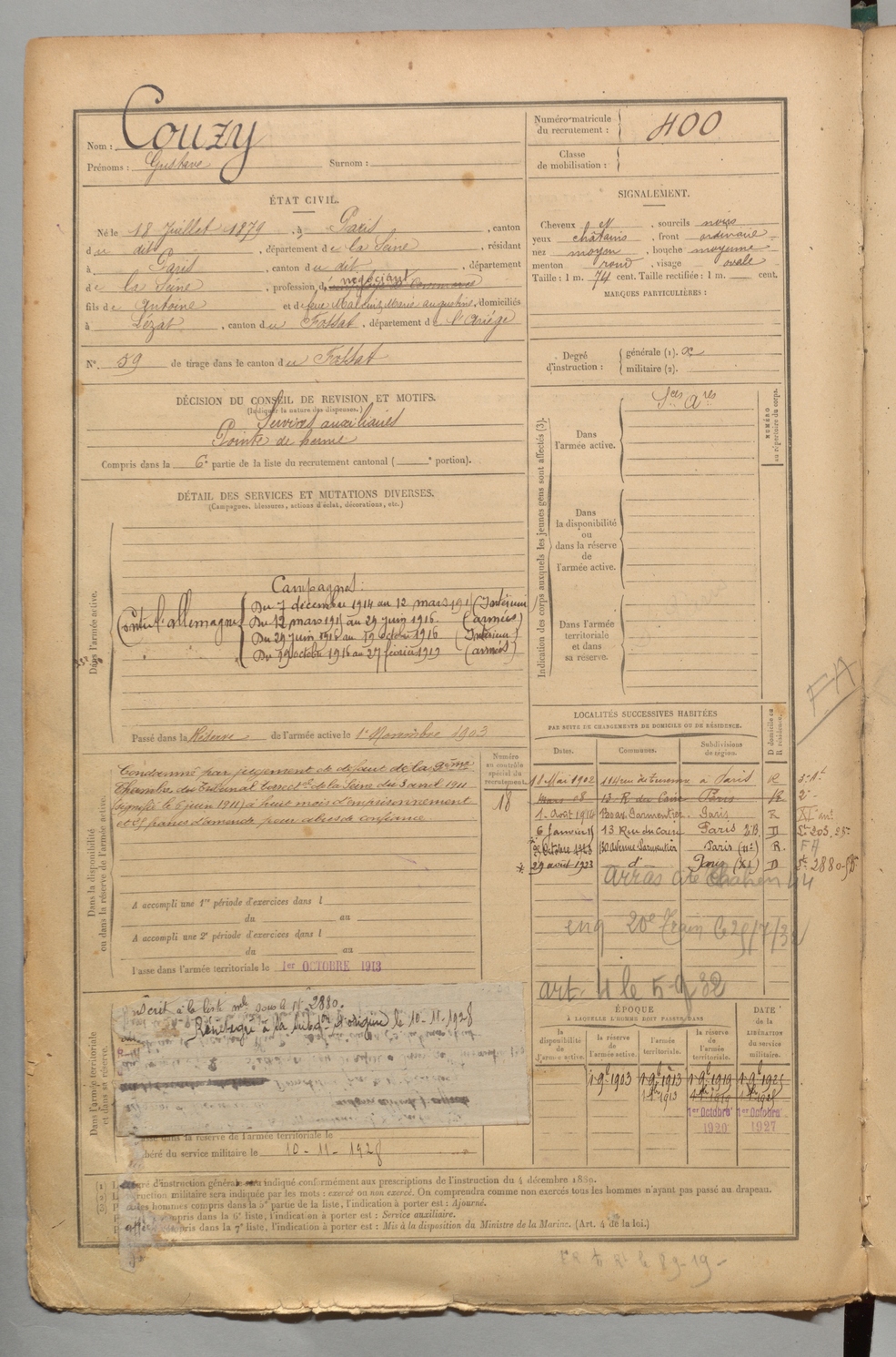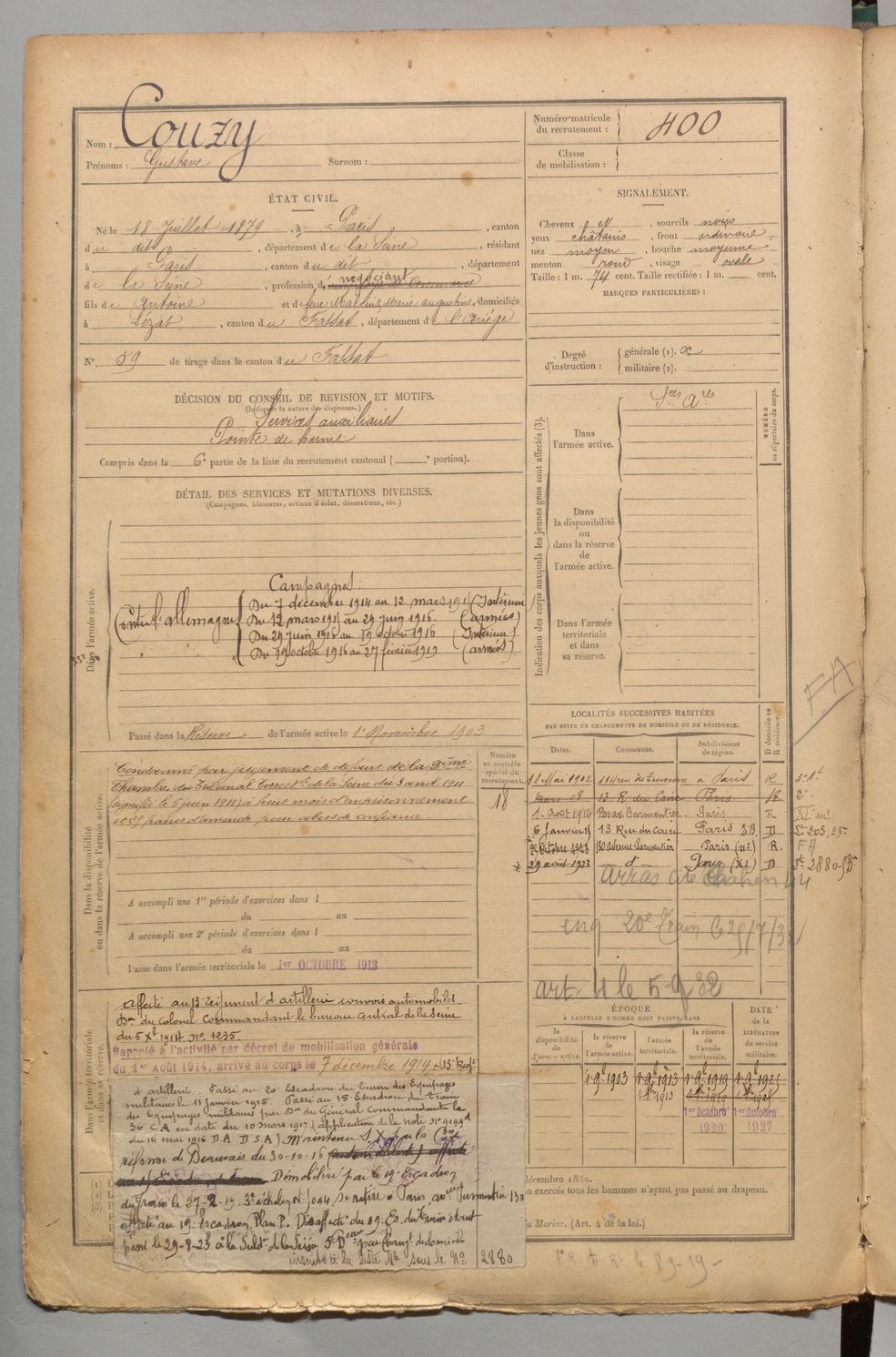 | Couzy | Gustave | FOIX | 1 R 456 | 1899 | Paris | Paris | 400 |