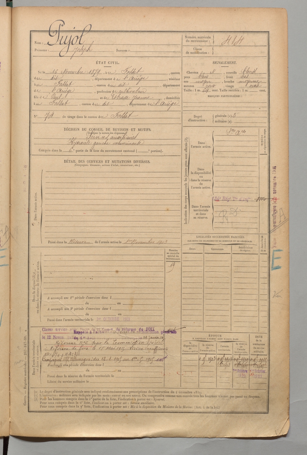 | Pujol | Joseph | FOIX | 1 R 456 | 1899 | Fossat (Le) | Fossat (Le) | 414 |