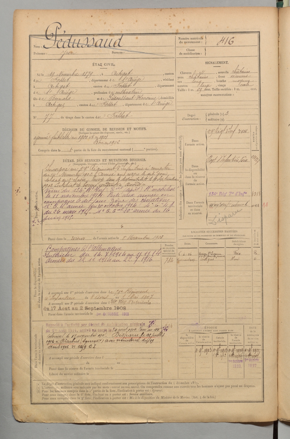 | Pédussaud | Jean | FOIX | 1 R 456 | 1899 | Artigat | Artigat | 416 |