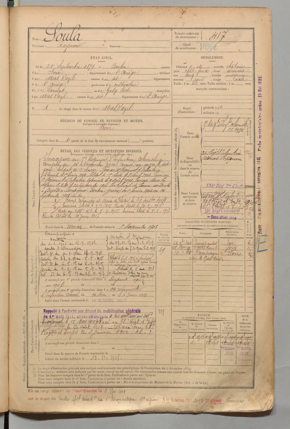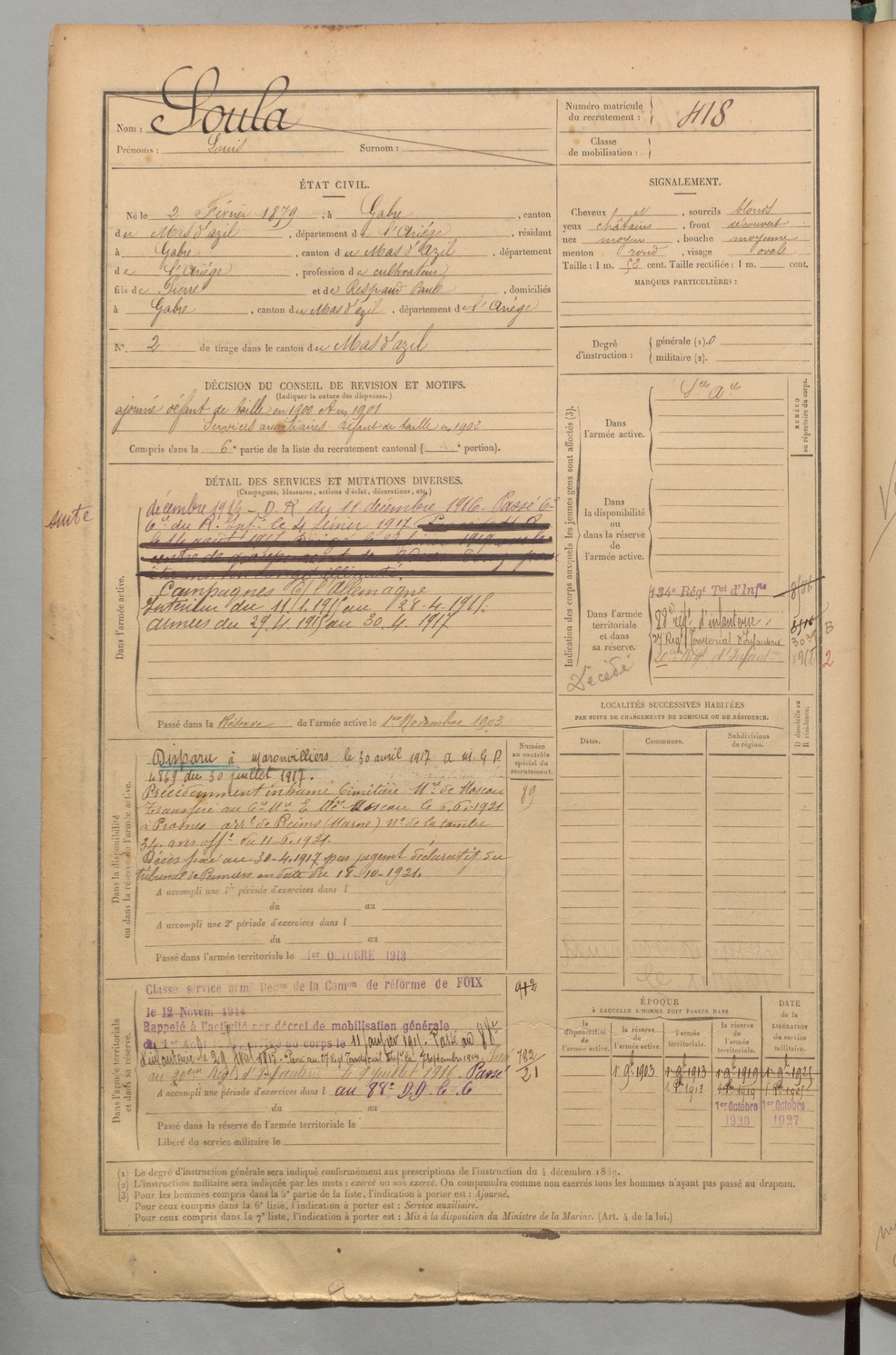| Soula | Raymond | FOIX | 1 R 456 | 1899 | Baulou | Mas-d'Azil (Le) | 417 |