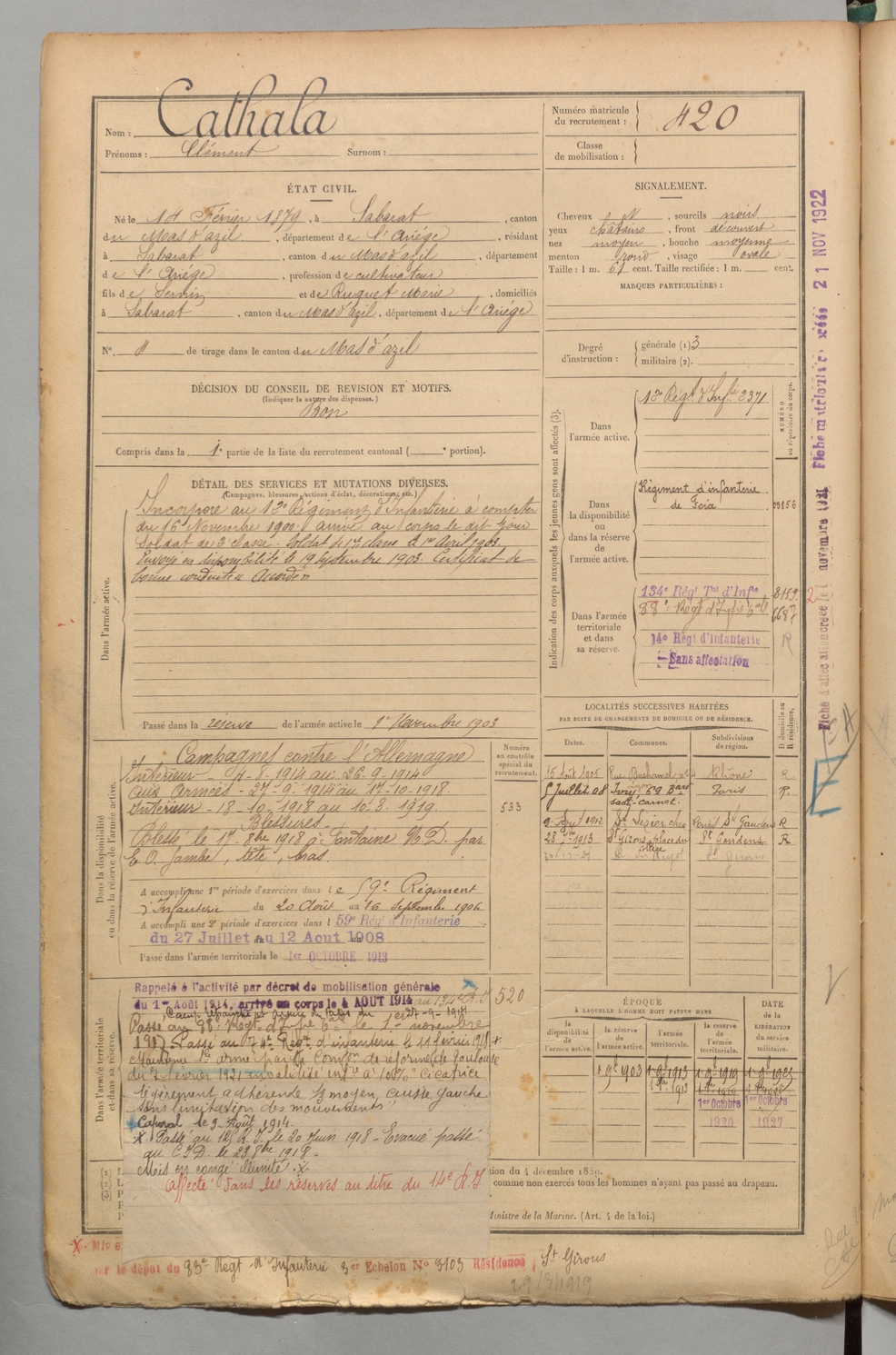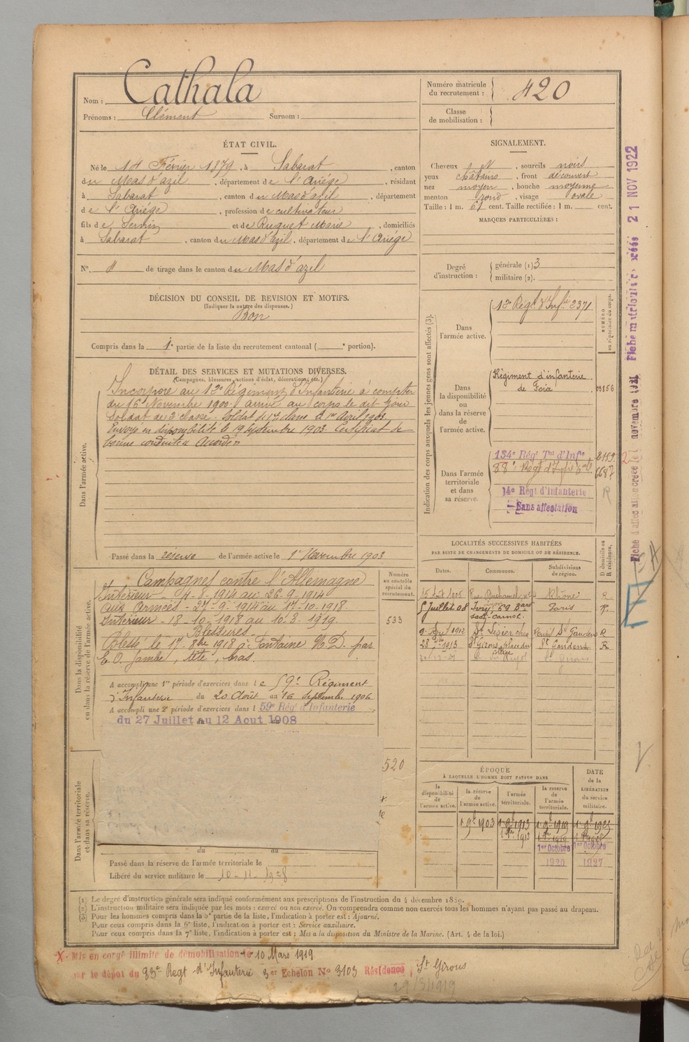 | Cathala | Clément | FOIX | 1 R 456 | 1899 | Sabarat | Sabarat | 420 |