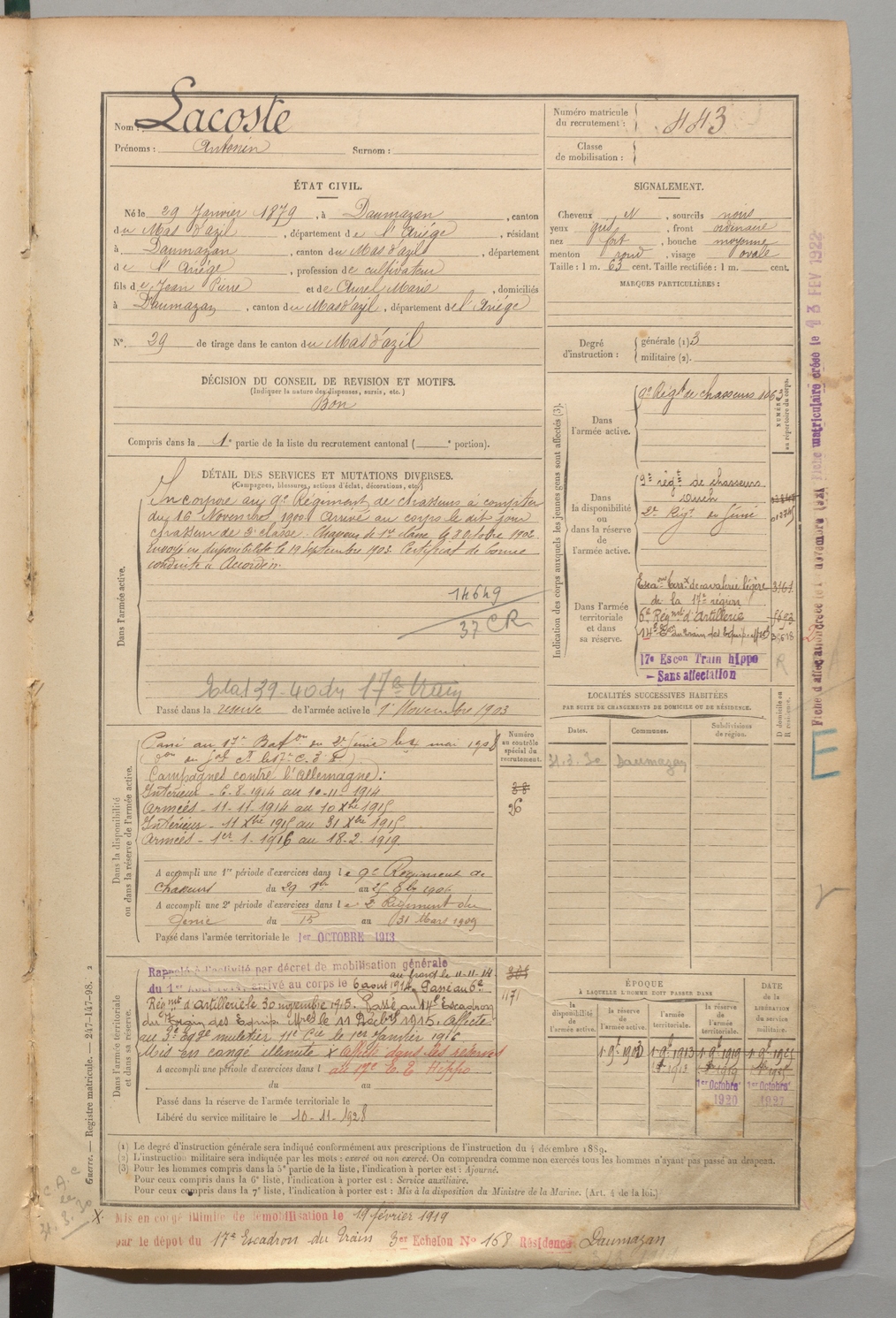 | Lacoste | Antonin | FOIX | 1 R 456 | 1899 | Daumazan | Daumazan | 443 |