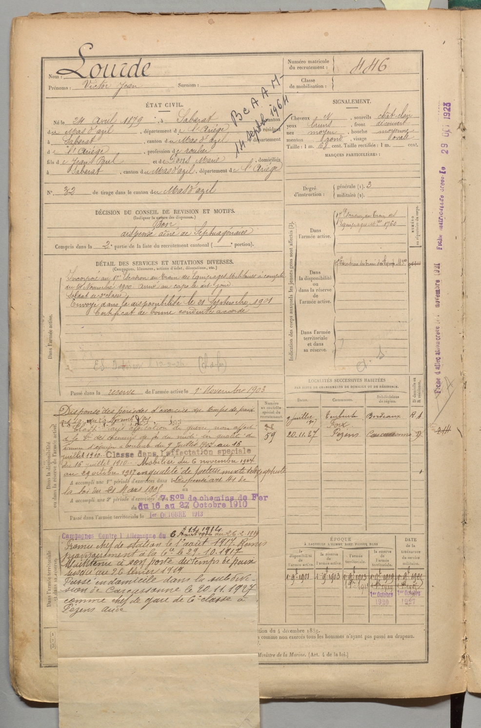 | Lourde | Victor Jean | FOIX | 1 R 456 | 1899 | Sabarat | Sabarat | 446 |