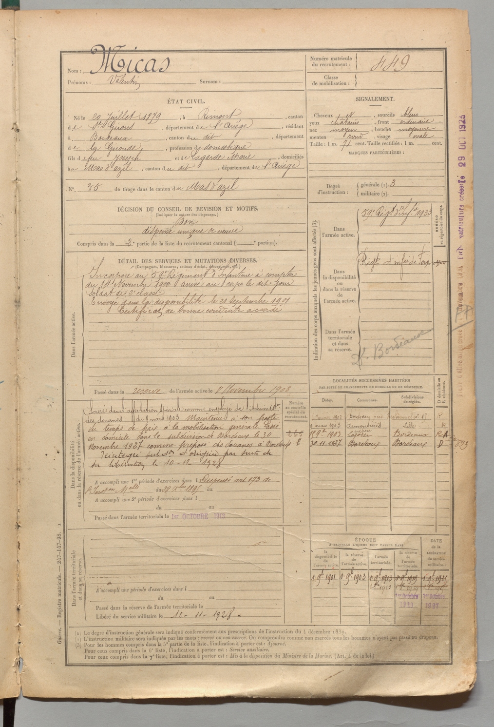 | Micas | Valentin | FOIX | 1 R 456 | 1899 | Rimont | Bordeaux | 449 |